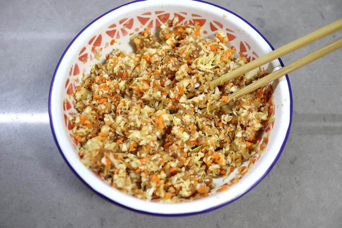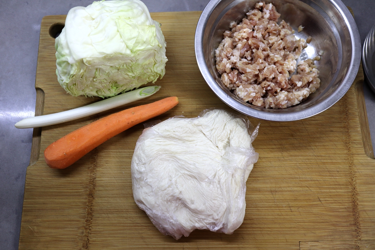 【主料】面粉300克,温水190克,猪肉馅150克,白菜头1块,胡萝卜1根
