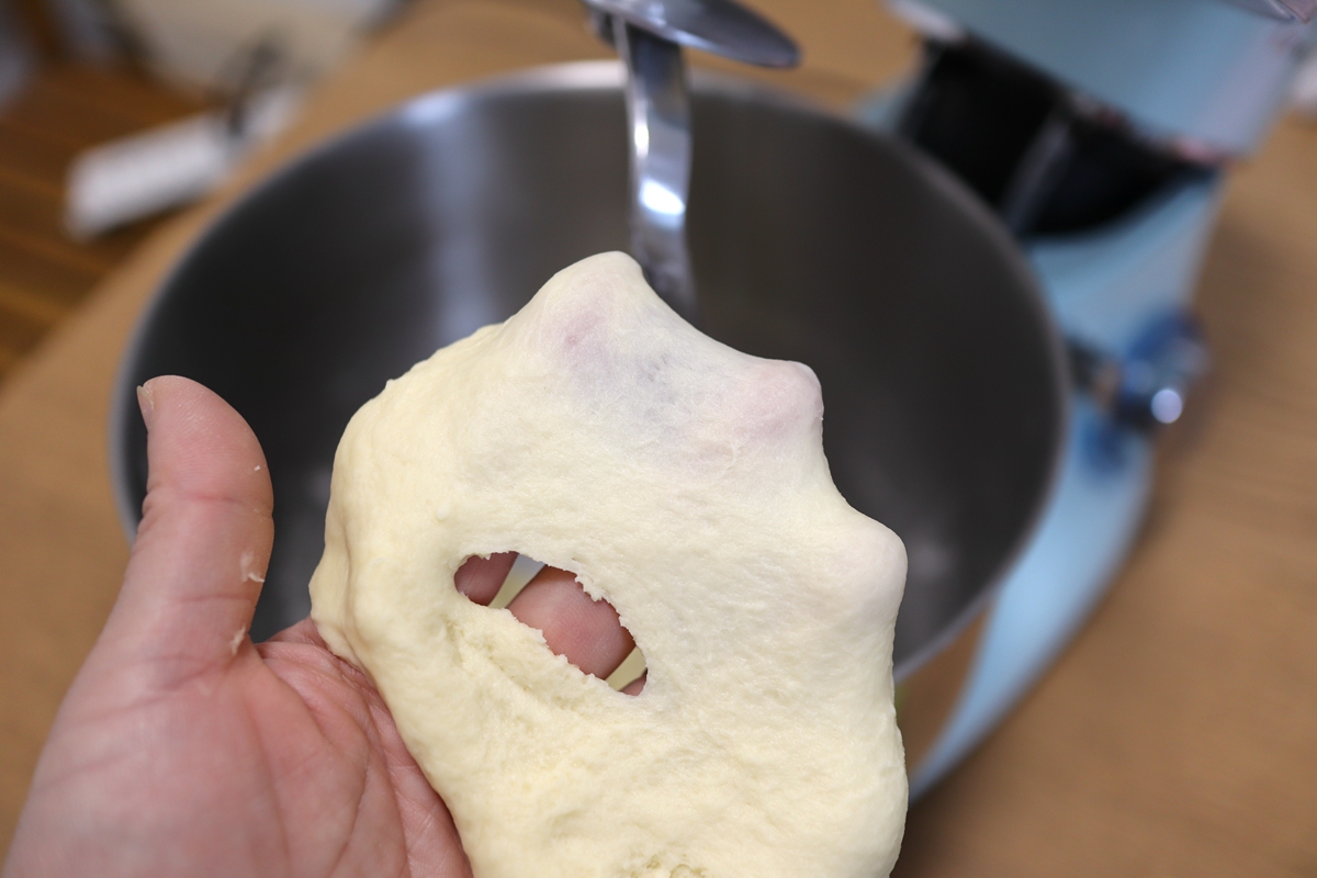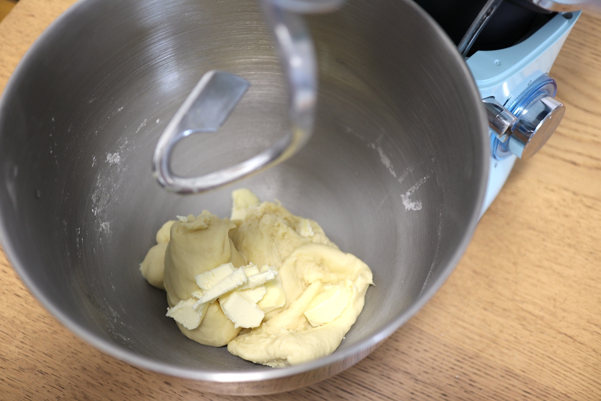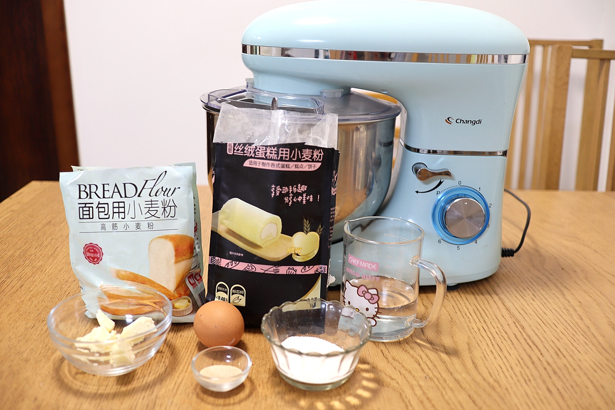 【主材料】高筋面粉250克,低筋面粉50克,耐高糖干酵母3克,鸡蛋55克,凉水140克,细砂糖30克,黄油25克