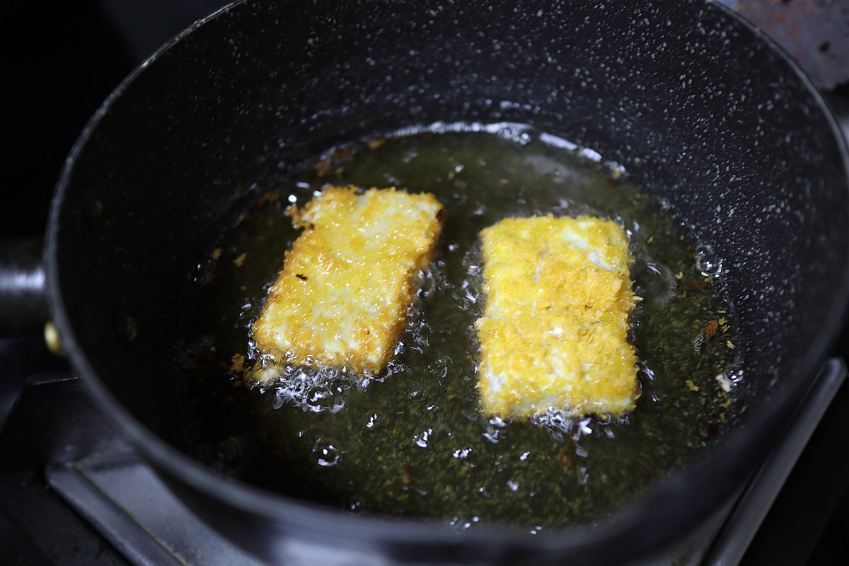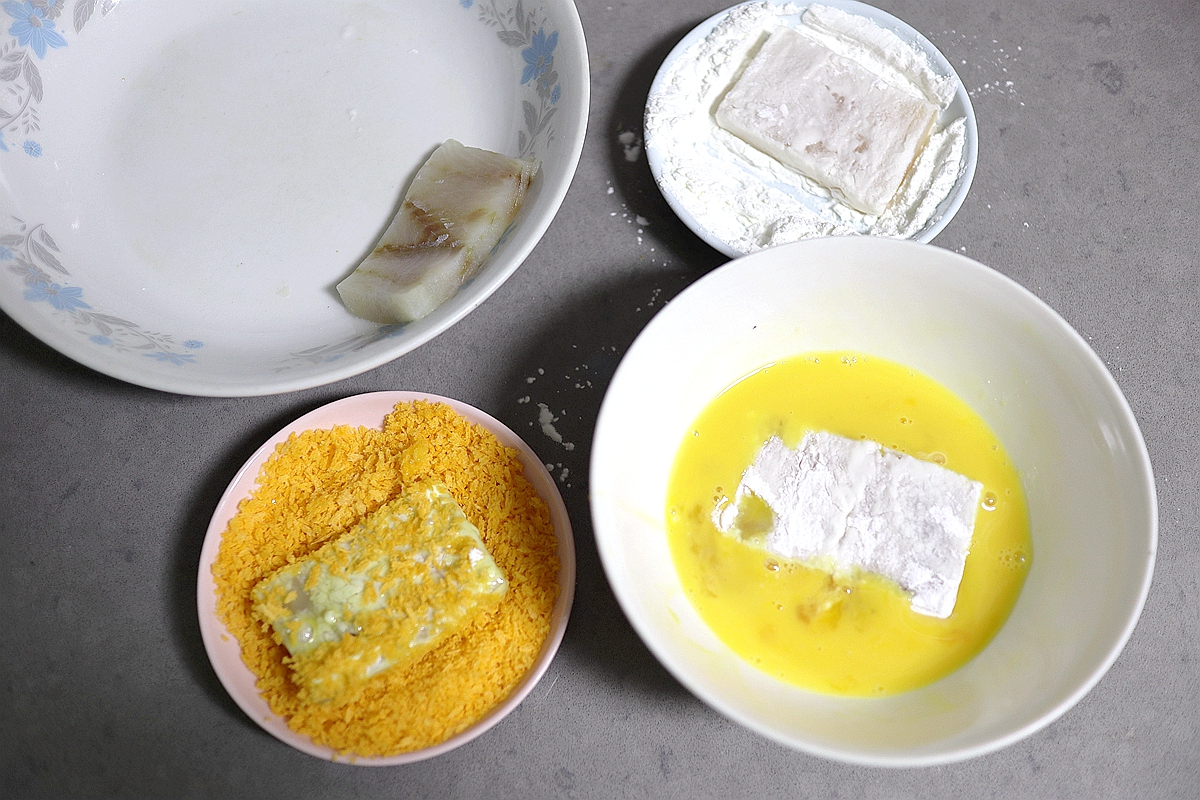 【夹馅】鳕鱼块,鸡蛋,淀粉,面包糠