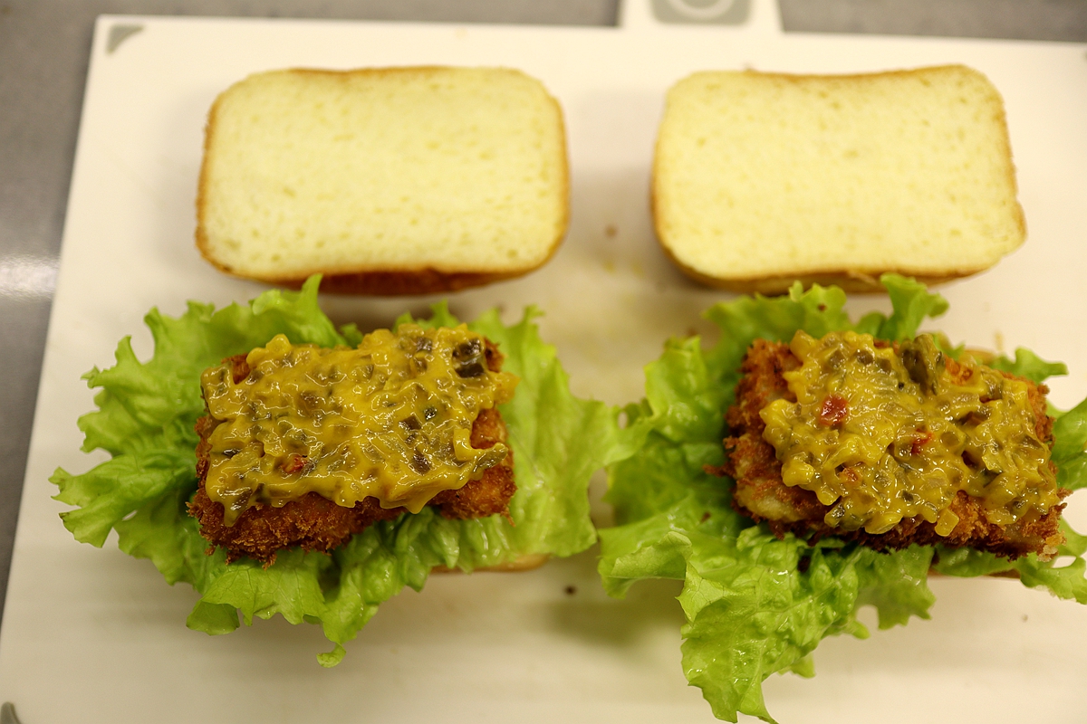 汉堡的平馅不固定,喜欢什么口味的就按自己的喜欢来搭配,甚至连麻辣鸡丁这种中式菜都可以夹在其中。