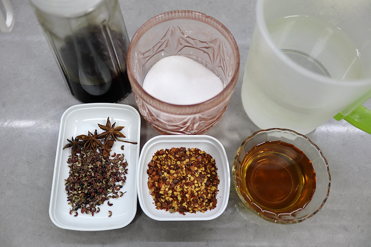 【调料】八角4颗,花椒1撮,干辣椒粉1碟,料酒1碗,酱油、盐,清水