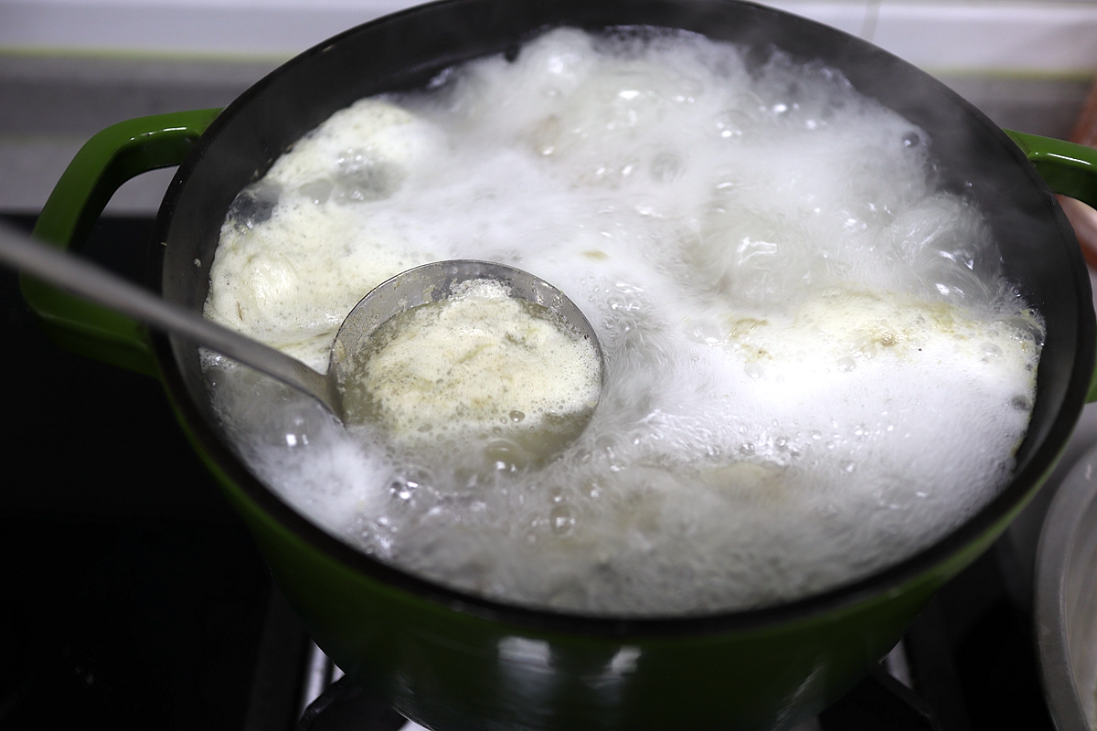 3. 鸭翅入凉水锅中,大火煮开后用勺子将浮沫撇走;轻轻翻动鸭翅,使更多的浮沫浮上来,撇得更干净;