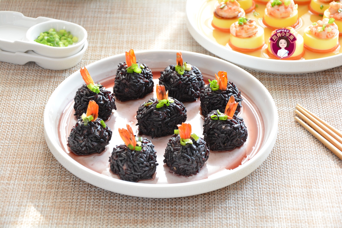 猪肉馅中我放了几只虾,少脂肪,多了优质蛋白质,还能让丸子口感Q弹,口味鲜嫩。很简单的材料做出了鲜美的味道,再加上玲珑可爱的小身材,一口或者两口一个,在春节的餐桌上很是应景。这道菜蒸一蒸,不放油,全靠肥猪肉撑着,而且盐份也不多,是真正的健康好菜。通体的紫黑色看着会有些压抑,所以我把虾尾插在了丸子上面。虾壳受热后变成了红色,与紫黑油亮的“黑珍珠”和少许香葱末相呼应,整道菜一下子就活泼起来了。