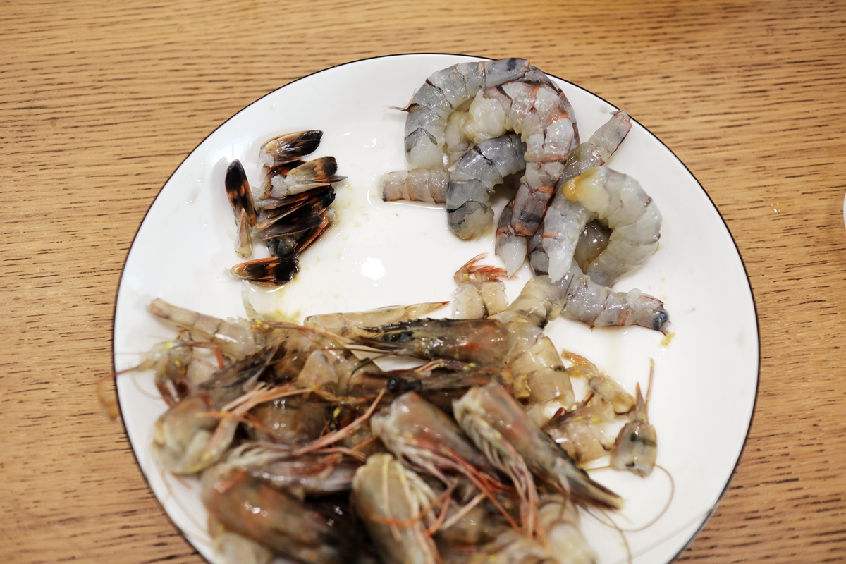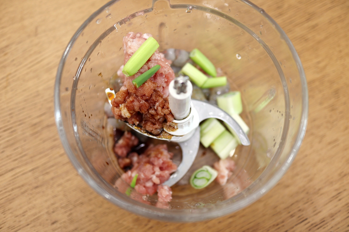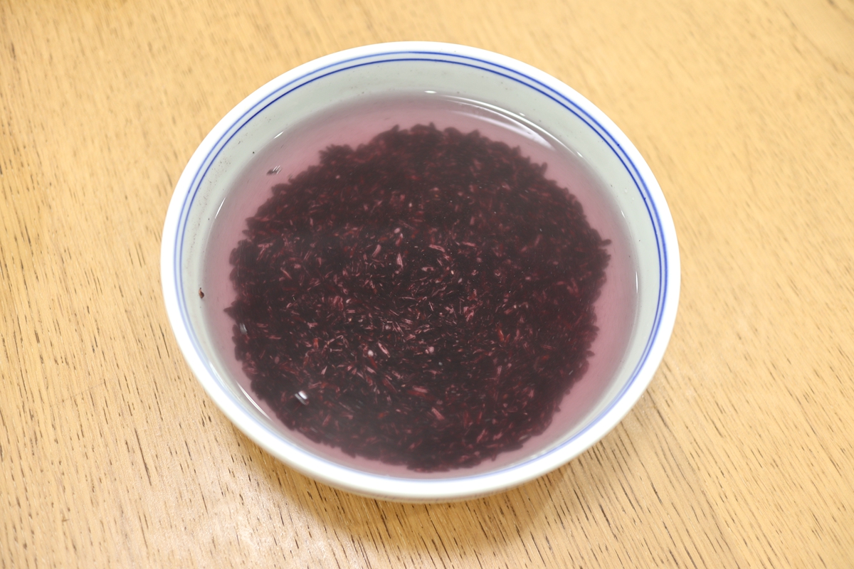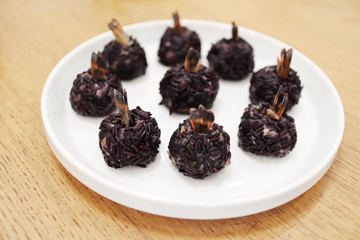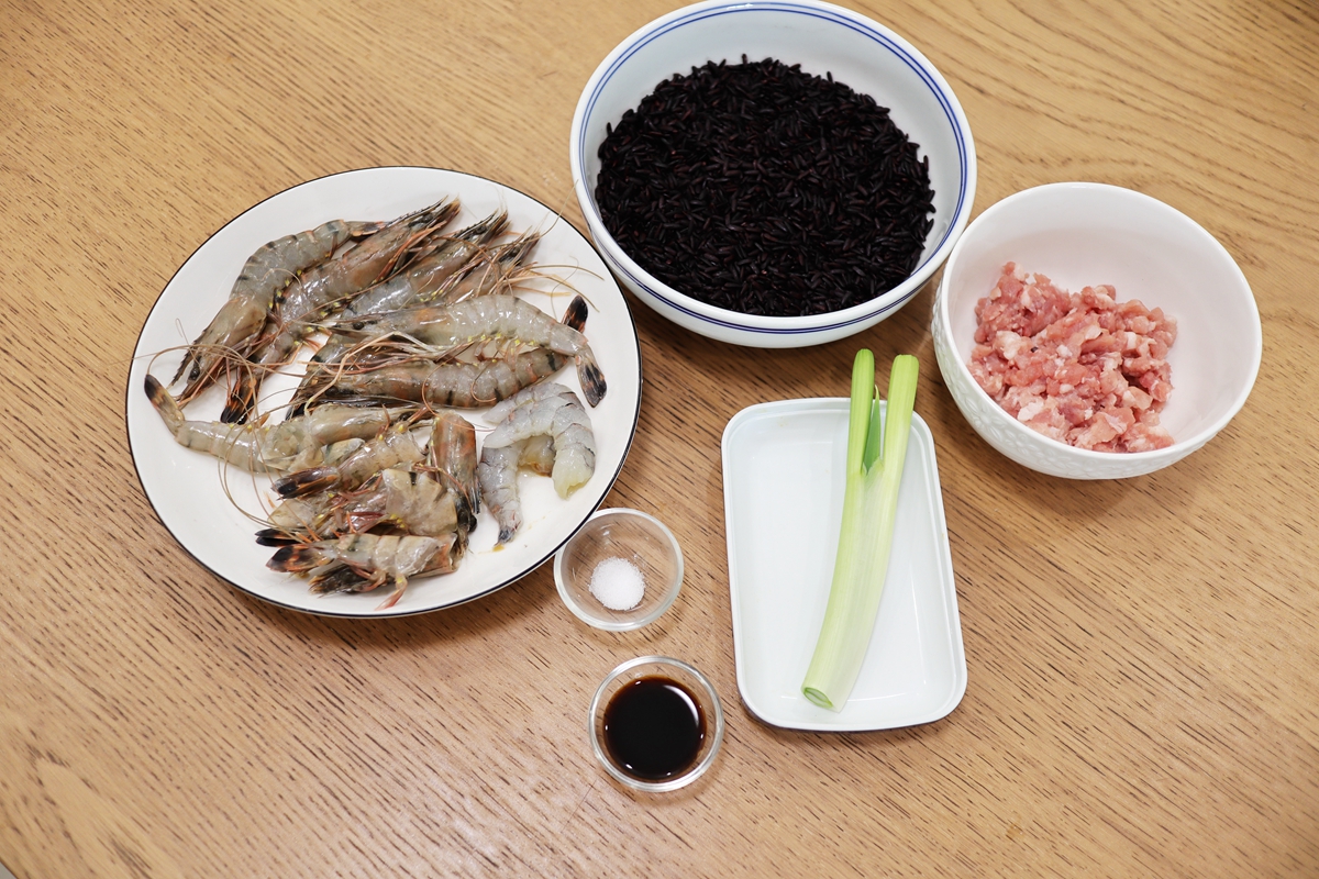 【材料】墨江紫糯米100克,虾10只,猪肉馅80克,大葱1段盐1克,生抽15克,清水适量,香葱少许