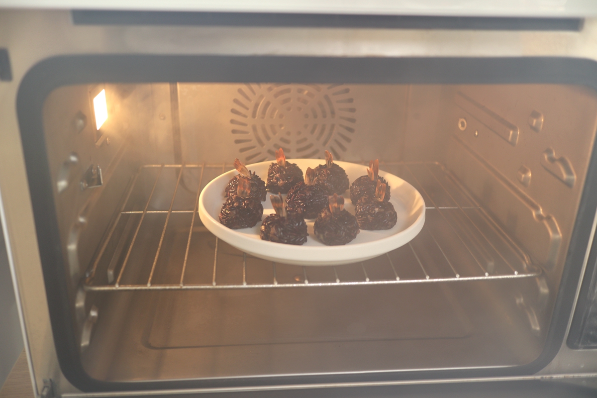 得嘞,我长话短说,您赶快跟着我做一盘吧,绝对是上得了席面、拿得出手的省时省事的春节年菜,如果非要讲个寓意,圆乎乎的丸子取意“团团圆圆”,顶部红色的虾尾取意“红(鸿)运当头”,紫黑色的造型似黑珍珠取意“财源滚滚”!