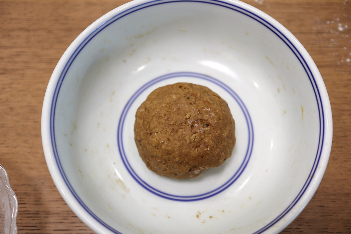 3. 把120克面粉、20克红糖、1个鸡蛋同入碗中,用筷子搅拌成絮状,再适量加凉水,直到没有干粉状态,用手揉成面团,盖盖子饧15分钟;