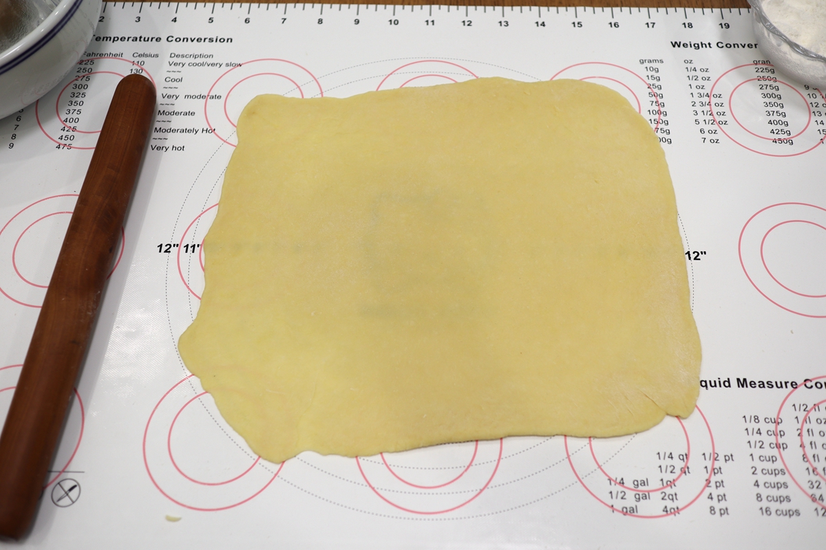4. 白面团放在揉面垫上,撒少许面粉防粘,擀成硬币厚的长方形面片;把面片移到干净的桌面上;