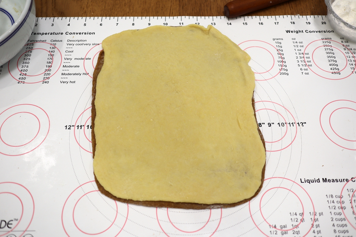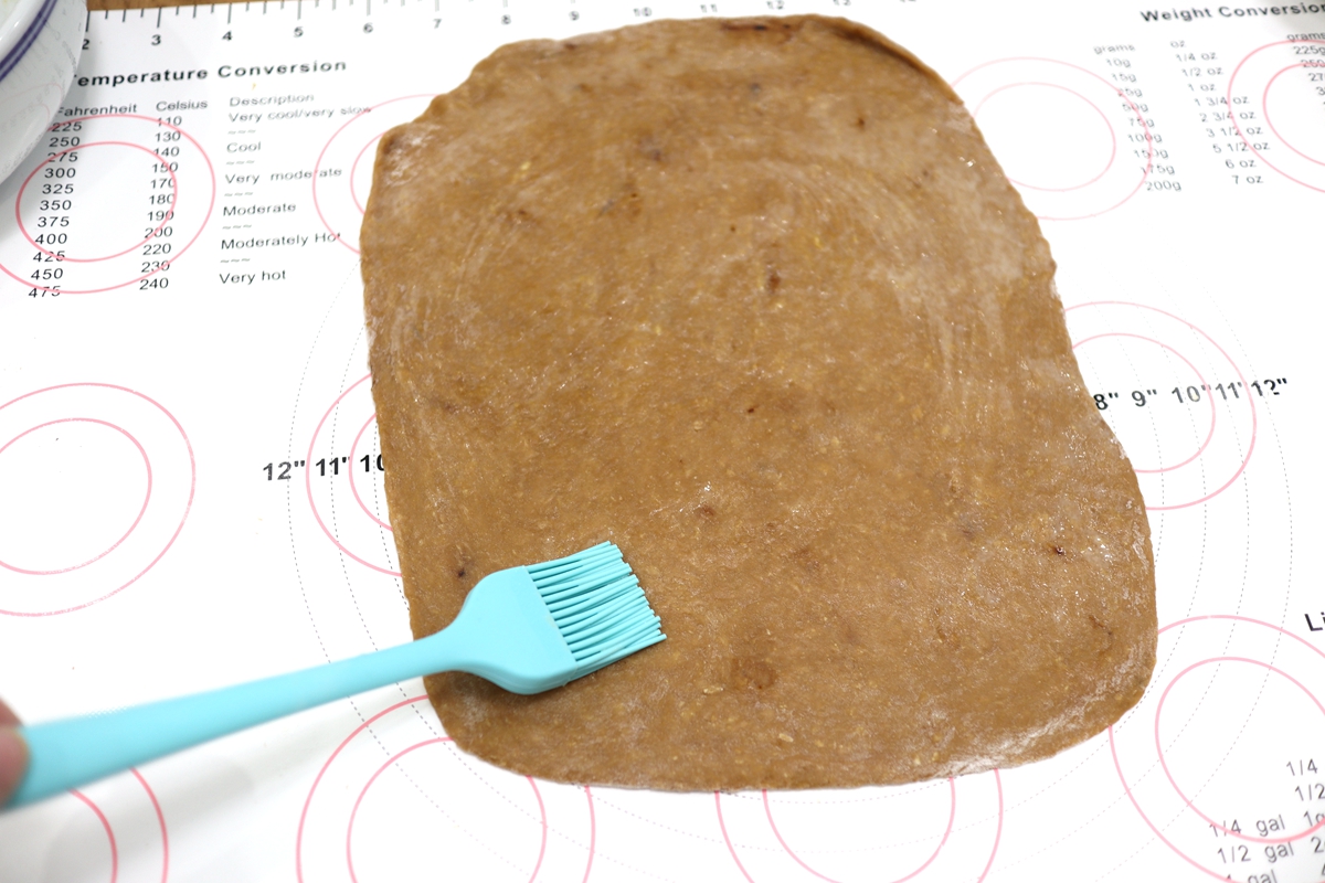 5. 把红糖面团也擀成硬币厚的长方形面片,面片表面刷一层清水;