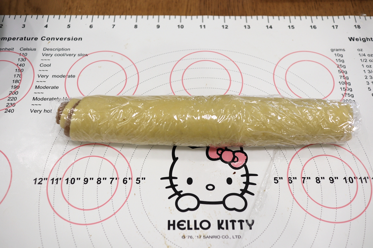 7. 哪个颜色的面皮朝外都可以,如果想让白面皮当表皮,将两张面皮翻转过来;从一边卷向另一边,再轻轻搓揉几下,使面卷贴合得更紧密,形状也更圆润些,用保鲜膜包裹住,入冰箱冷藏1-2小时,使面卷变得硬一点点,利于后面切薄片;