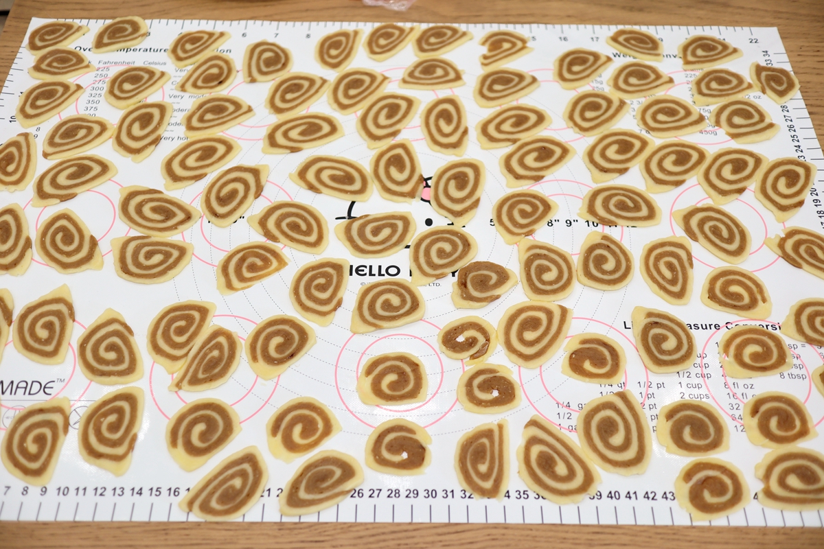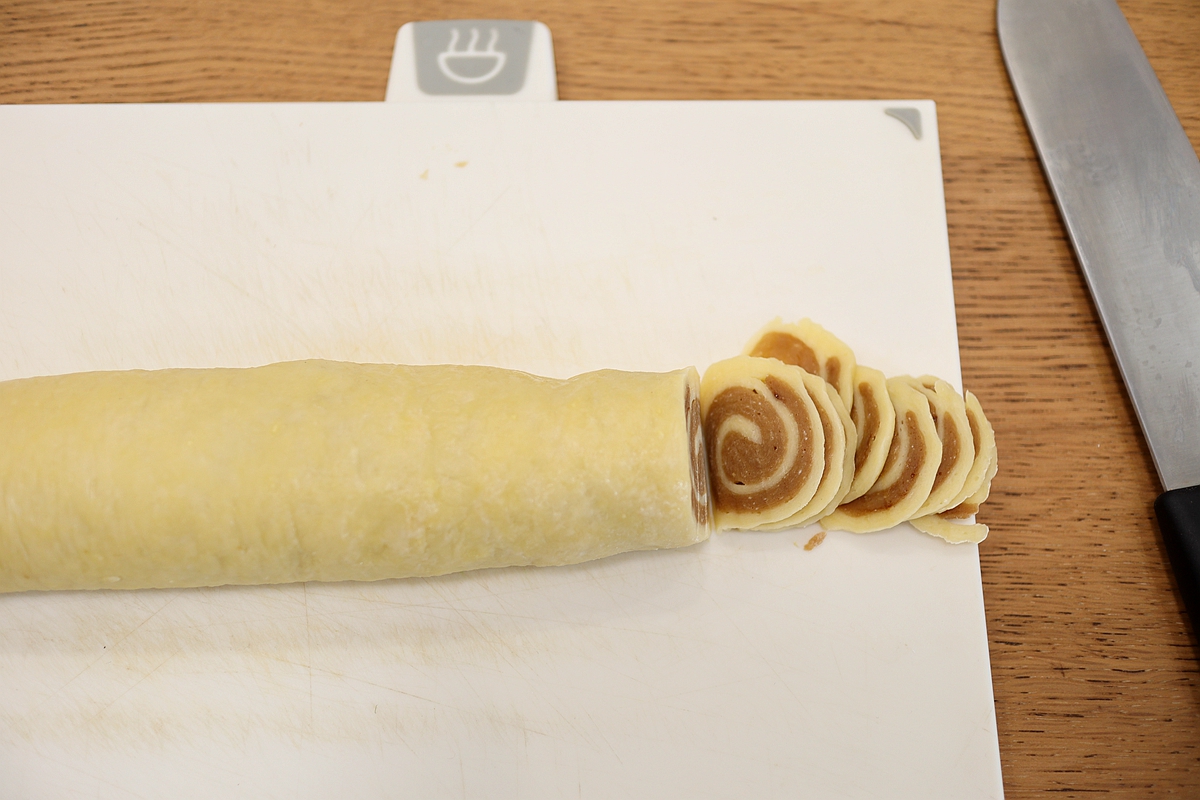 8. 冷冻变硬的面卷用利刀切成薄片,厚度约2-3毫米;这就是“猫耳朵”生坯;