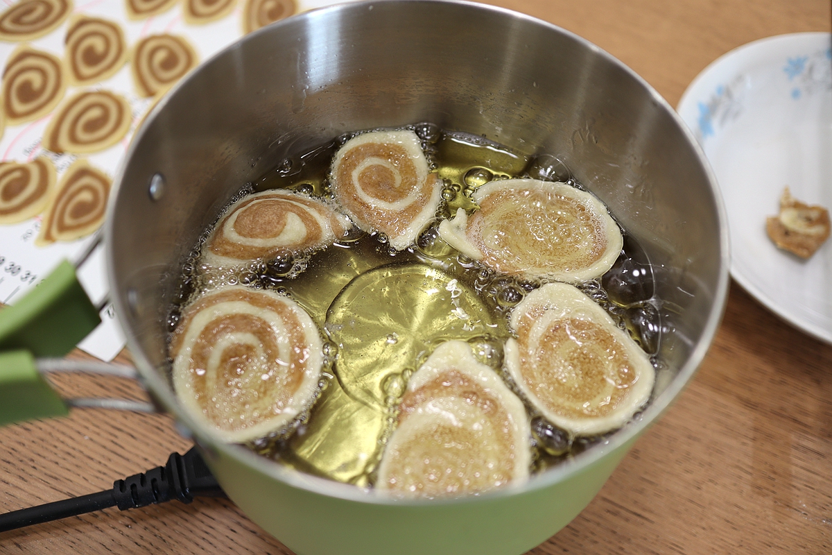 10. 油锅里倒半锅油,用一根木筷子或者竹筷子插在油锅里,筷子边缘有小气泡冒出时将“猫耳朵”生坯入油中,炸到飘浮在油面上;