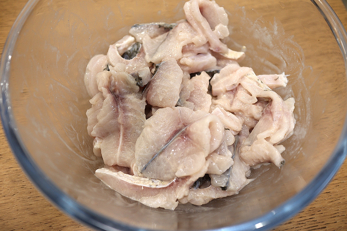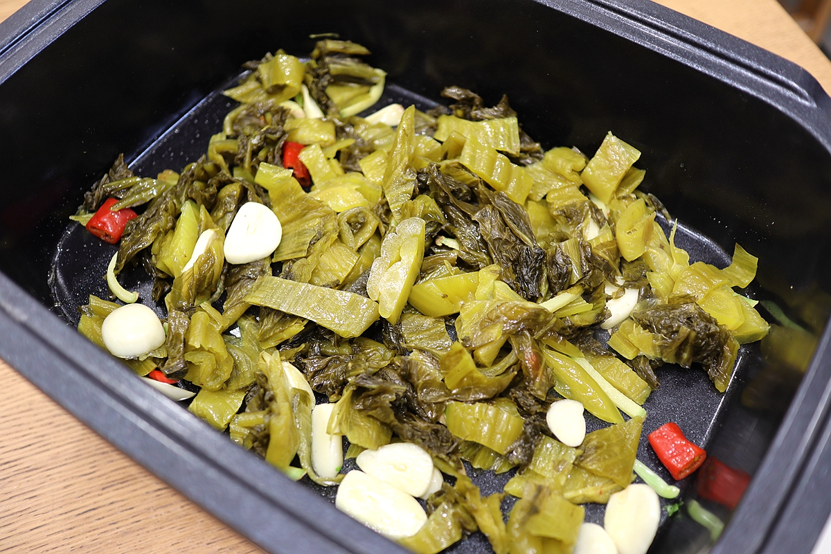 酸菜我就从超市买的,虽然年年冬天我北方人也要“积酸菜”,但这种酸菜跟酸菜鱼所用的酸菜不可同日而语。北方的酸菜是用大白菜腌的,做白肉酸菜粉条和酸菜馅饺子那是没得挑儿,但是要做酸菜鱼还得用南方特别是四川的酸菜。四川的酸菜所用的是长满绿叶的芥菜,菜帮子较小,口感清脆,菜叶子肥大但又特别吸味儿。咱自己做不了,就直接买超市现成的。把鱼片做好了,就能弥补咱不会腌四川酸菜的缺憾了。
