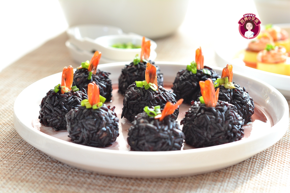 9. 将紫糯米虾球即黑珍珠丸子摆放在盘子中,再将虾尾插在丸子顶部;