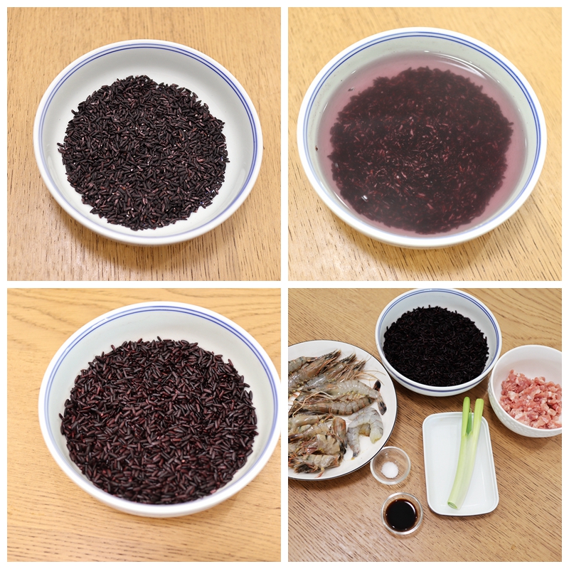 【材料】紫糯米100克,虾10只,猪肉馅80克,大葱1段,盐1克,生抽15克,清水适量,香葱少许