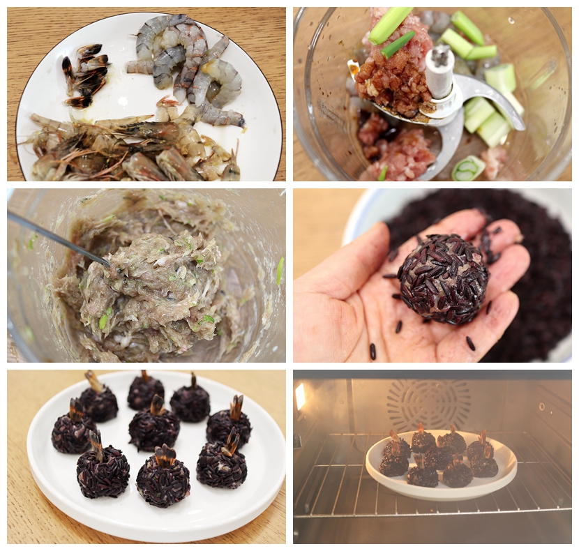 8. 取适量虾肉团成球状,在紫糯米中滚几圈,再用手指将紫糯米按压结实,这就是黑珍珠丸子生坯;