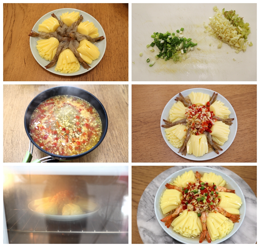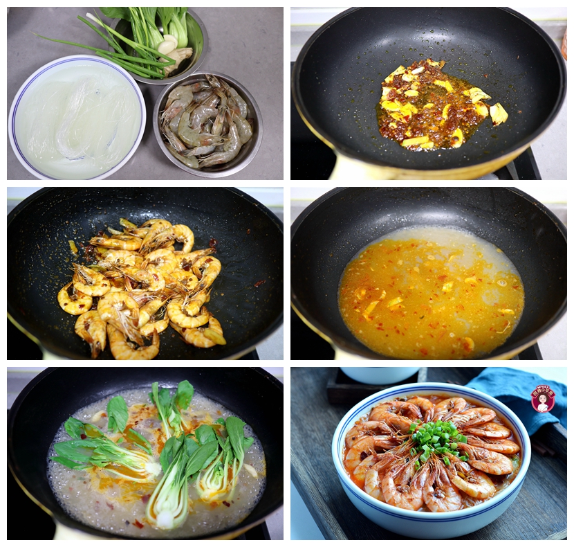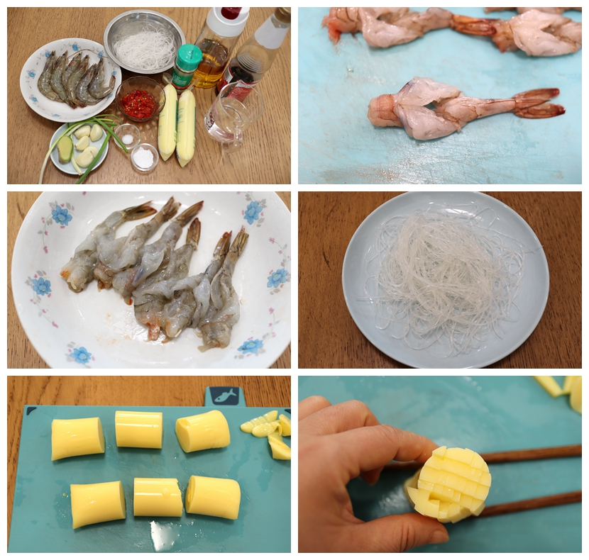【材料】豆腐2条,大虾6只,绿豆粉丝1把