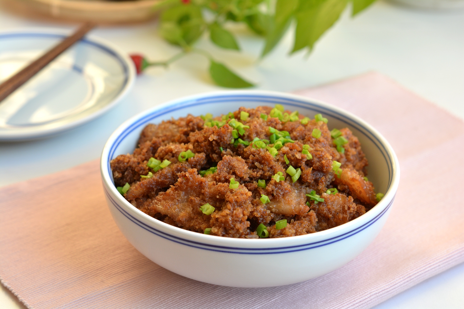 粉蒸肉,是将腌透入味的肉片裹一层米粉再上锅蒸。浸透了油脂的米粉软糯有滋味,肉片也因油脂渗入米粉中糯而清香,酥而爽口,米粉油润,香味比较浓郁。