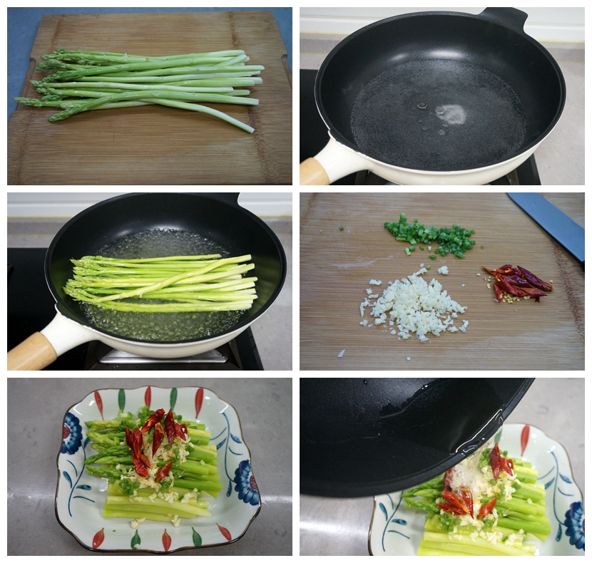 【材料】芦笋1把,干红辣椒3个,大蒜1头,香葱2棵,蒸鱼豉油适量,植物油少许