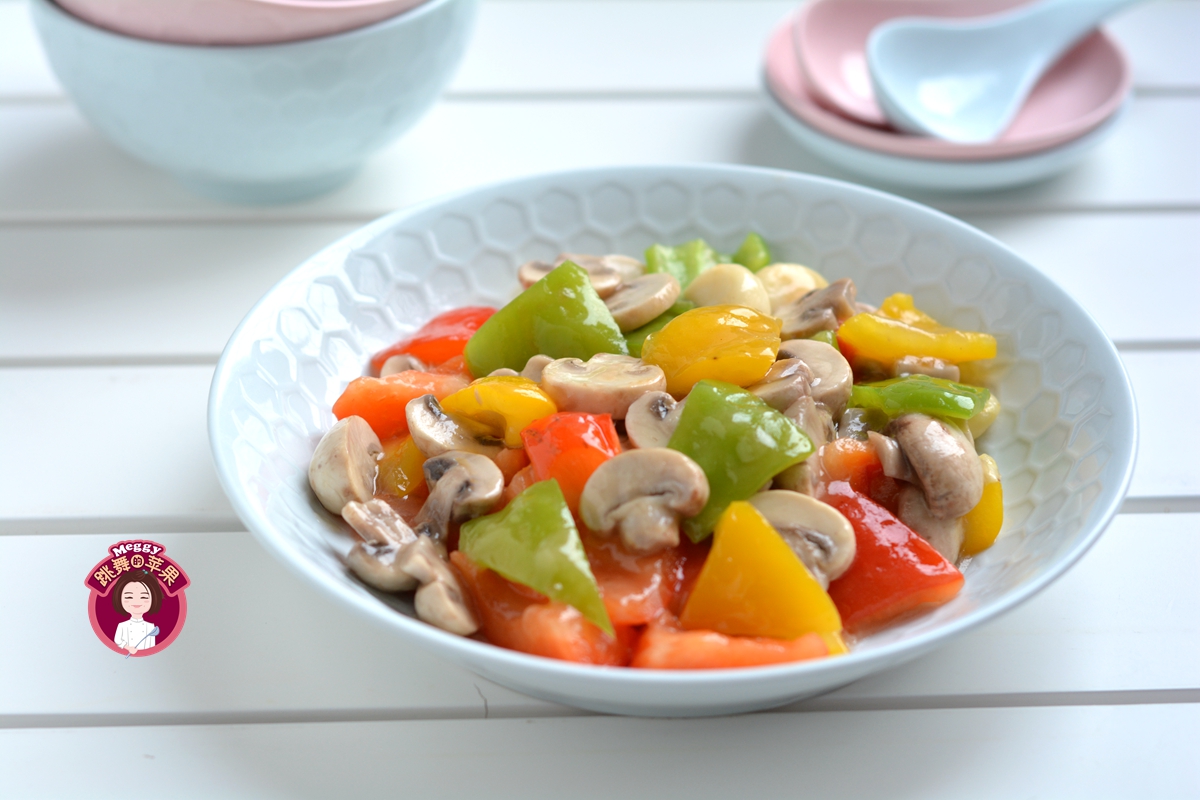 2. 因为彩椒和蘑菇都不易入味儿,勾芡可以使咸味能挂在菜的表面。