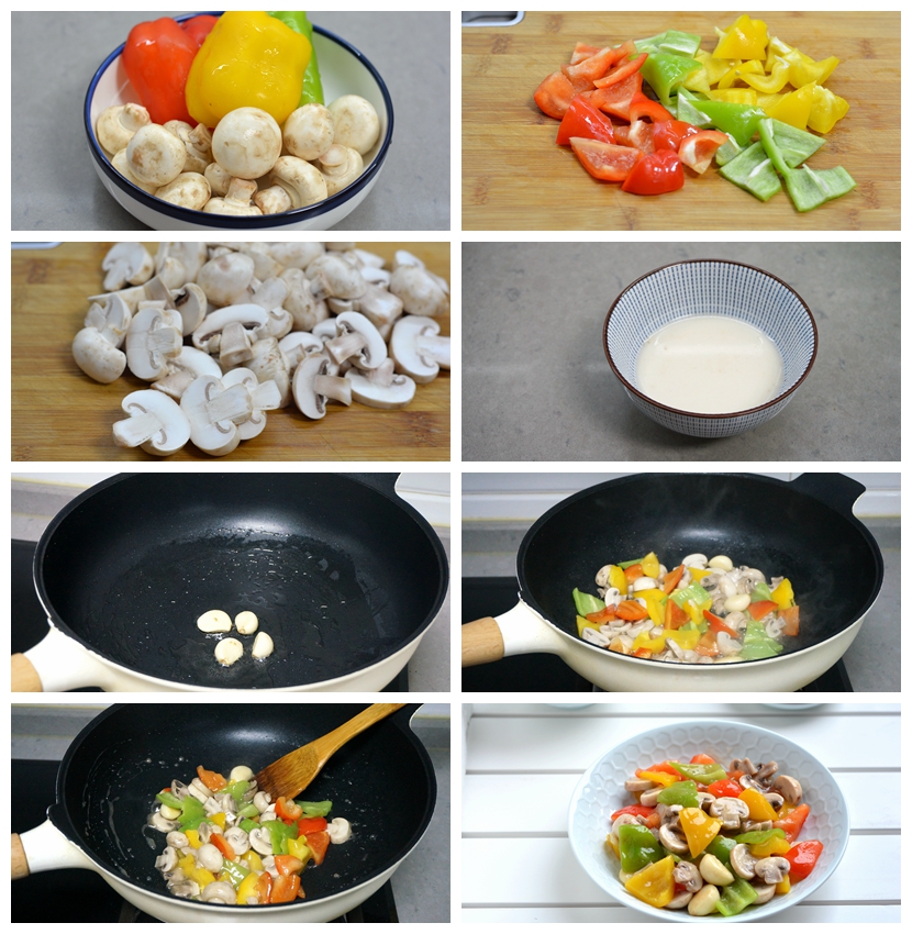 【材料】口蘑1盘,辣椒半根,红甜椒半个,黄甜椒半个,油少许,盐少许,淀粉1勺,凉水少许,大蒜4瓣
