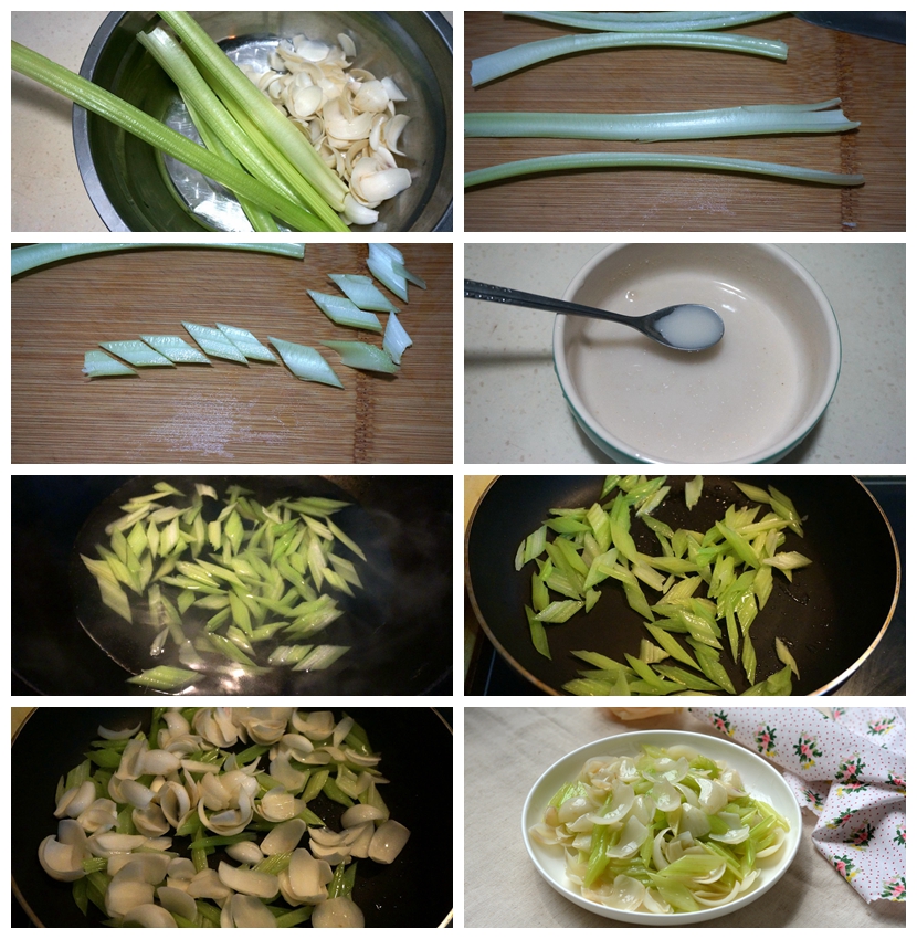 【材料】芹菜1棵,百合2头,油适量,盐少许,淀粉1勺,清水适量