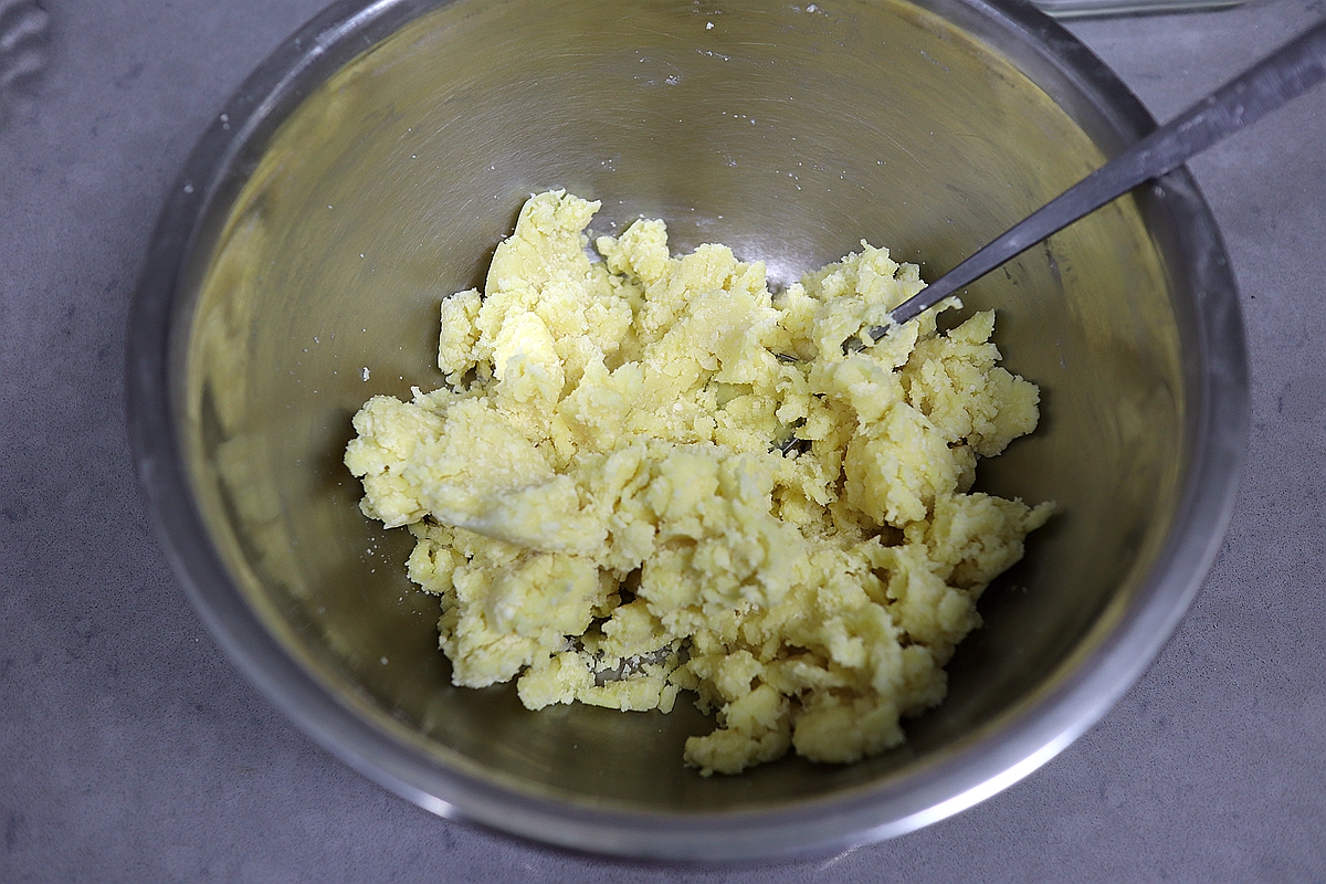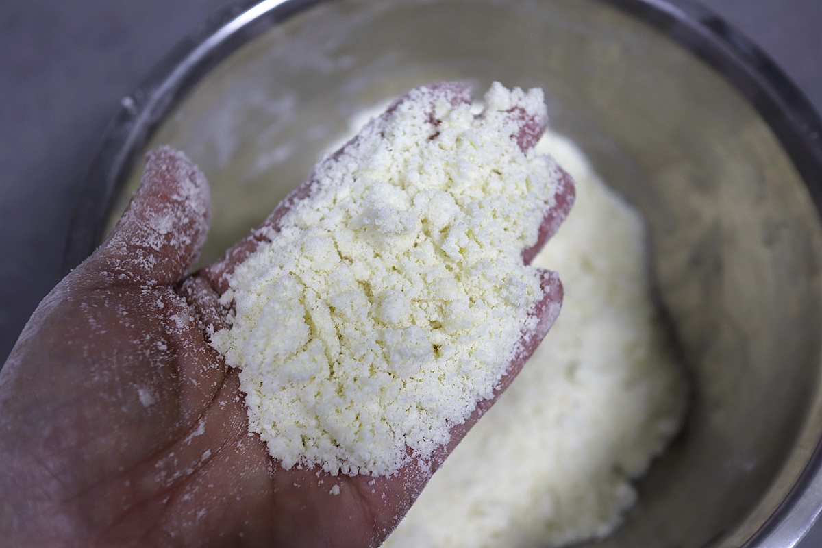 3. 用手搓成粉粒状,并且要用手将其捻成均匀的小粒;