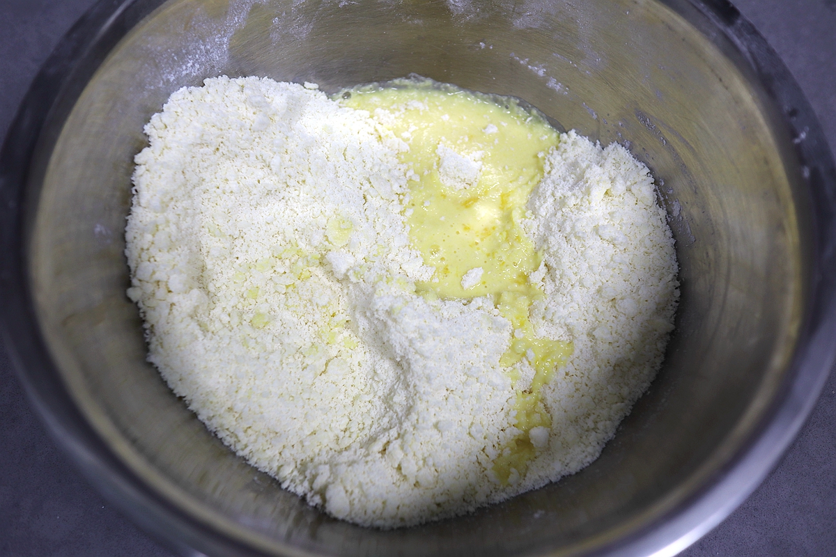 4. 蛋黄和牛奶混合后倒入粉粒;