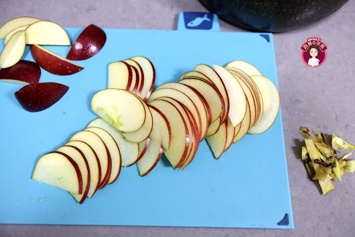 7. 冷藏面片的时候来处理一下馅料和奶油奶酪糊;先来处理馅料:苹果洗净,一切两半,再用利刀切成薄约1-2毫米的苹果片,苹果核可在切片前挖掉,也可以切片后分别切掉;