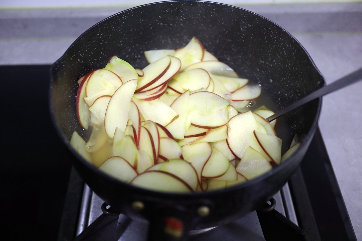 8. 苹果片和细砂糖20克,凉水100克同入小锅中,小火加热,煮至苹果片变软、透明状,停火,自然晾凉后使用;