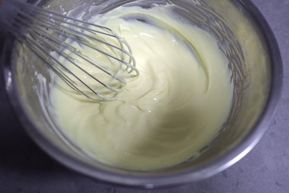 11. 蛋白糊分两次与蛋黄奶酪糊混合;