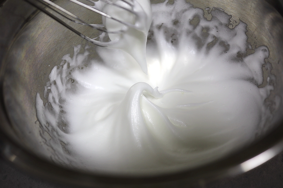 10. 鸡蛋清和细砂糖用电动打蛋器打至8分状态,提起打蛋器,蛋白糊呈软软的大弯钩状;