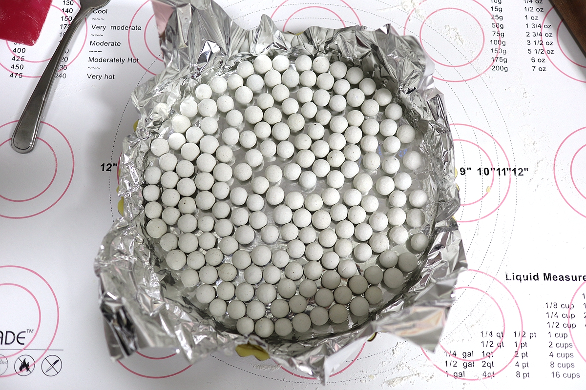 15. 派皮上铺锡纸,哑光面贴着派皮,锡纸上再铺烘焙石,入预热好的烤箱中层,上火180度,下火200度,烤10-15分钟出炉;这一步是将派皮定型,烤到半熟;