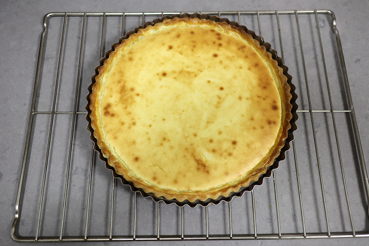 18. 送入烤箱中,上火180度,下火210度,烤20分钟,此时奶酪糊8分熟;边缘是固态且有微微金黄色,而中心还有些黏湿;