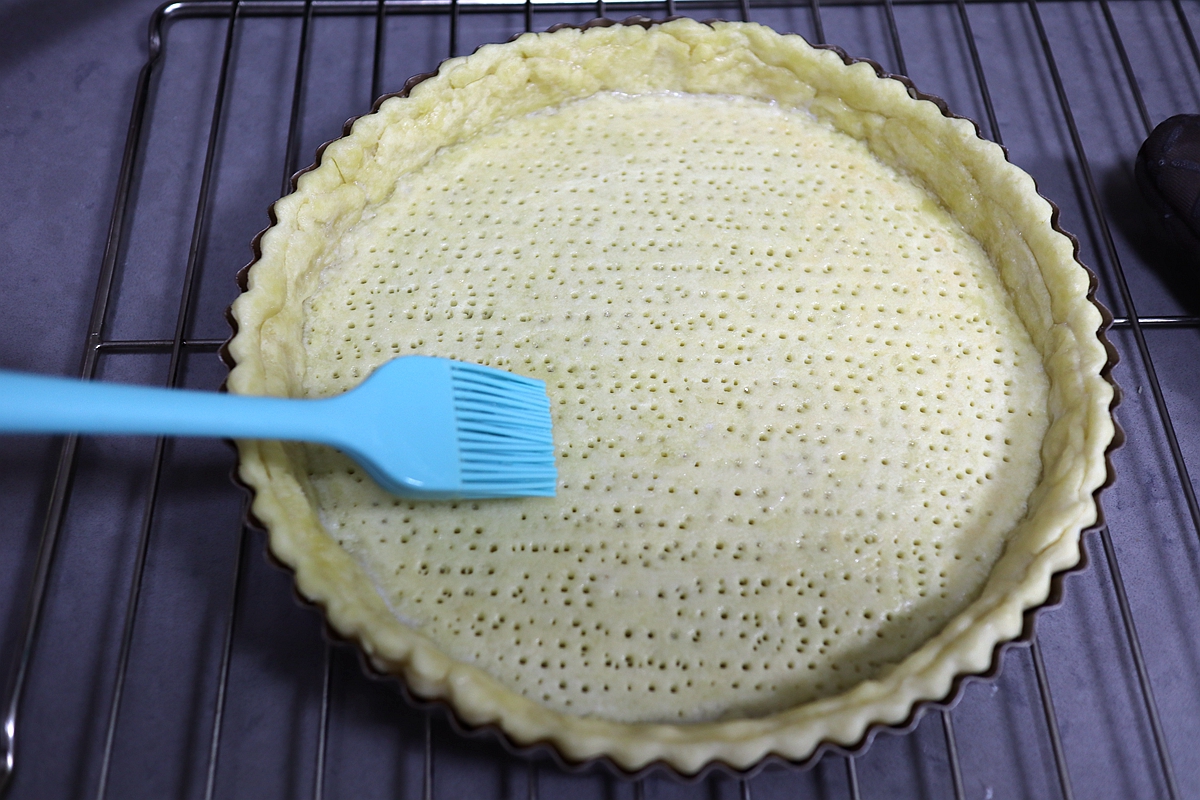 16. 5分钟后,烘焙石稍微冷却,将锡纸和烘焙石撤走,派皮表面刷一层鸡蛋清(份量外);重新入烤箱中,上火170度下火200度烤2分钟;这样做的目的是使派皮底部形成一个保护膜,隔绝奶酪糊的水分和湿气;