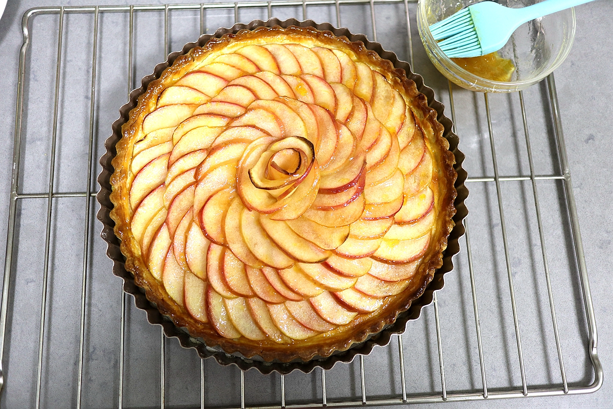 22. 苹果派出炉后,用刷子将杏酱均匀地抹在苹果片上,防止苹果片水分蒸发的同时还能增亮,还可以撒少许防潮糖粉;凉后切块食用,冷藏保存2天。