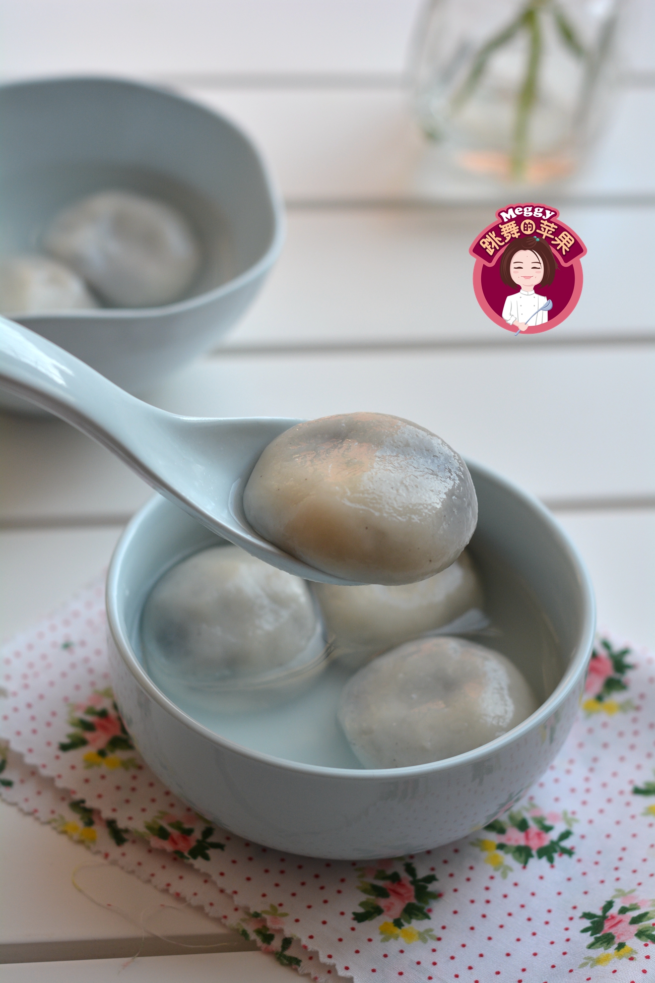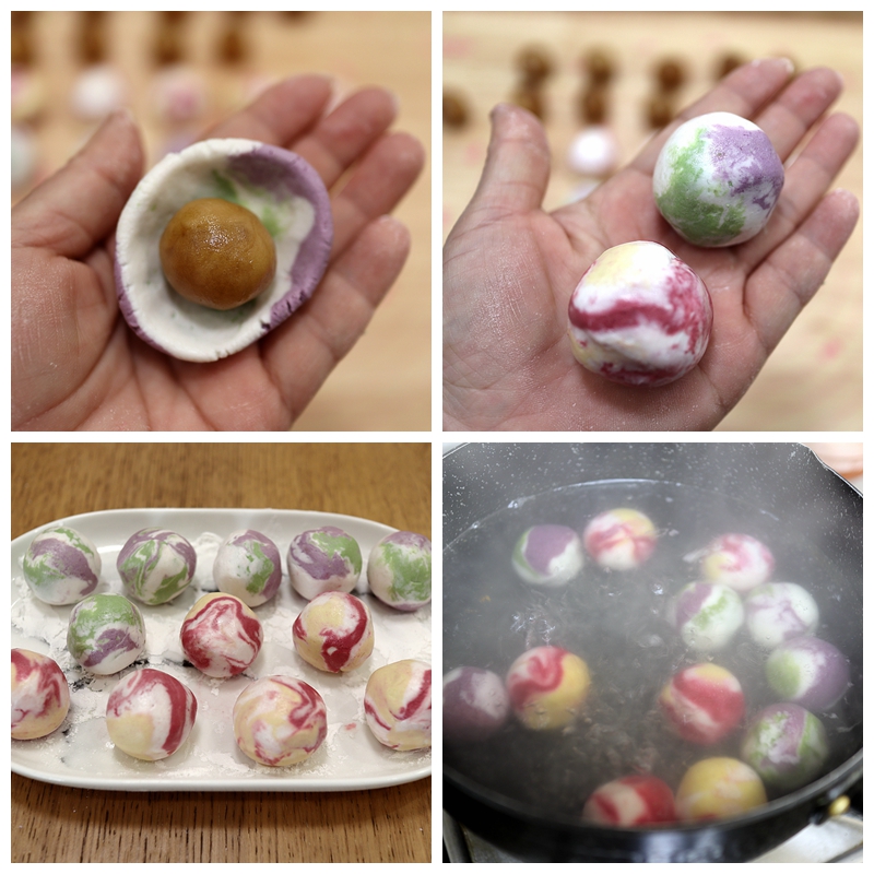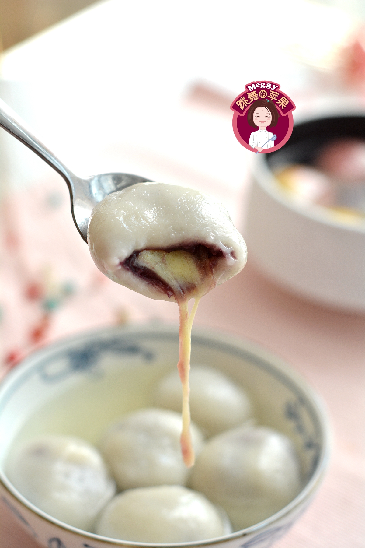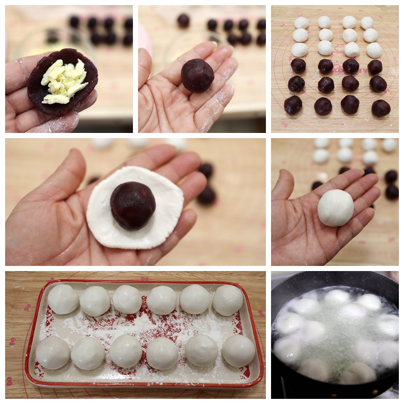 8. 汤圆皮和包着奶酪的紫薯球全部到位;