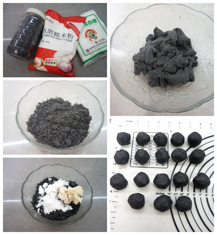 【材料】糯米粉200克,凉水适量,生黑芝麻160克,白糖65克,猪油65克