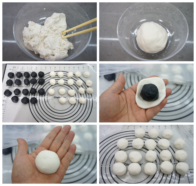8. 将糯米面团和黑芝麻馅料各分成18等份;