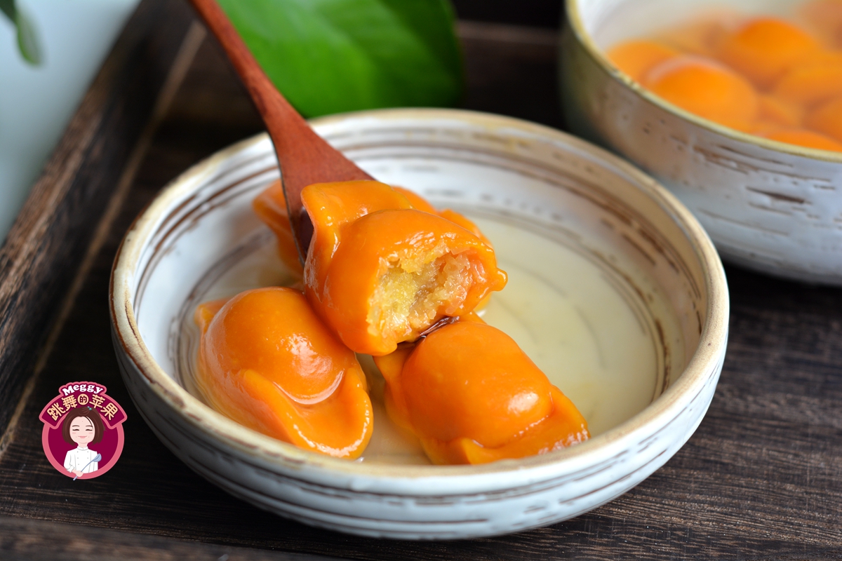 3. 取一块鸡蛋黄大小的南瓜糯米团,放在热水锅中煮成透明状,时间约为1分钟;