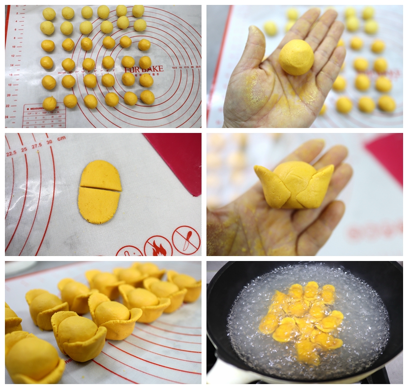7. 剩下的12个糯米南瓜球做元宝的两翼:取一个小球搓成椭圆形,按扁,用刮刀拦腰分成两半;