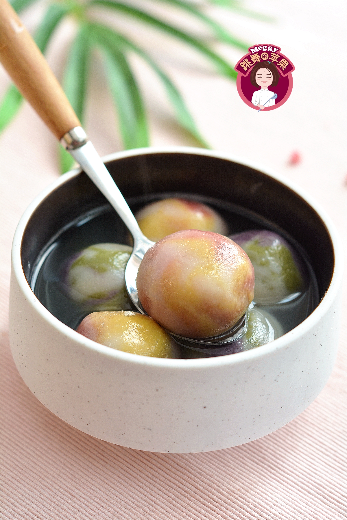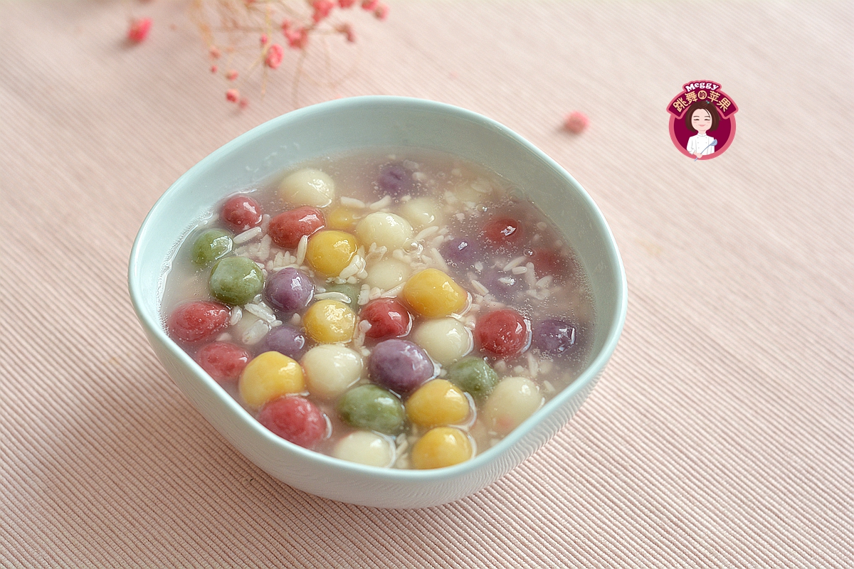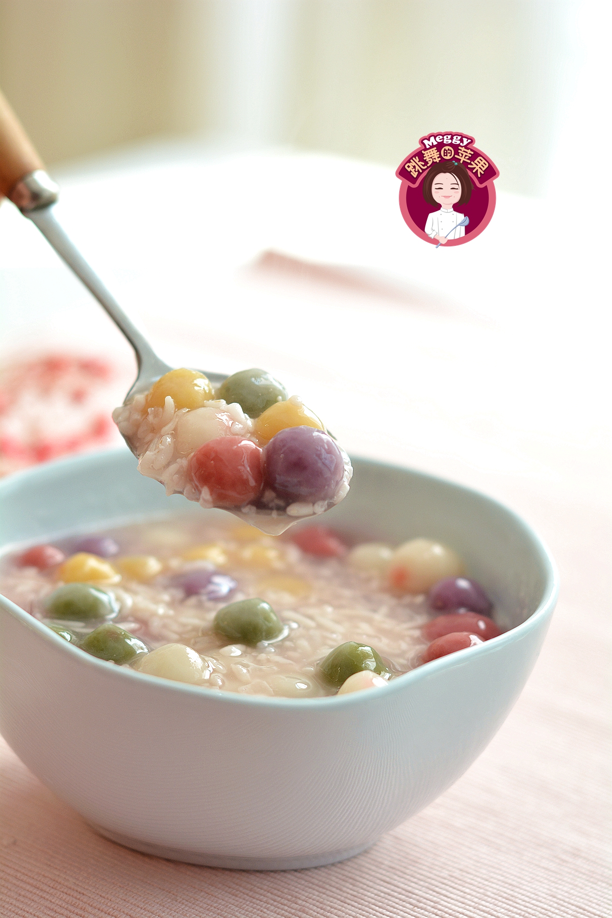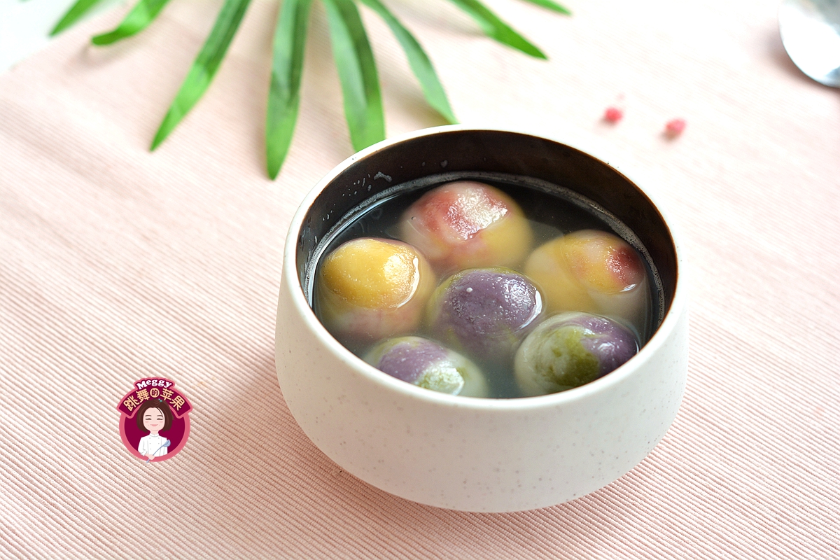 【材料】 糯米粉150克,大麦苗粉2克,南瓜粉2克,紫薯粉2克,红甜菜粉2克,凉水适量,醪糟3大勺,冰糖数粒
