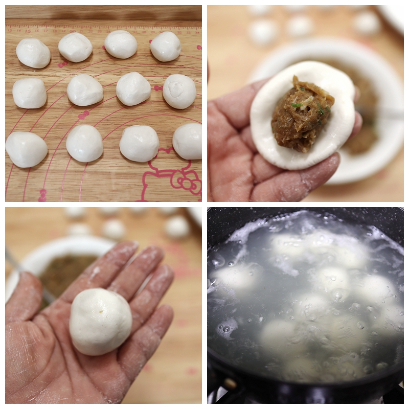 8. 将冷冻15分钟的肉馅取出,把糯米球按扁,再捏成小圆皮,舀一勺肉馅放在上面;