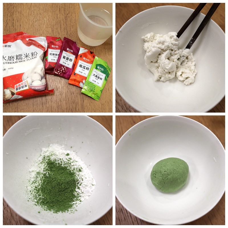 3. 彩色糯米团:30克糯米粉和2克大麦苗粉倒入碗中,凉水逐量加入,用筷子搅拌成团状;