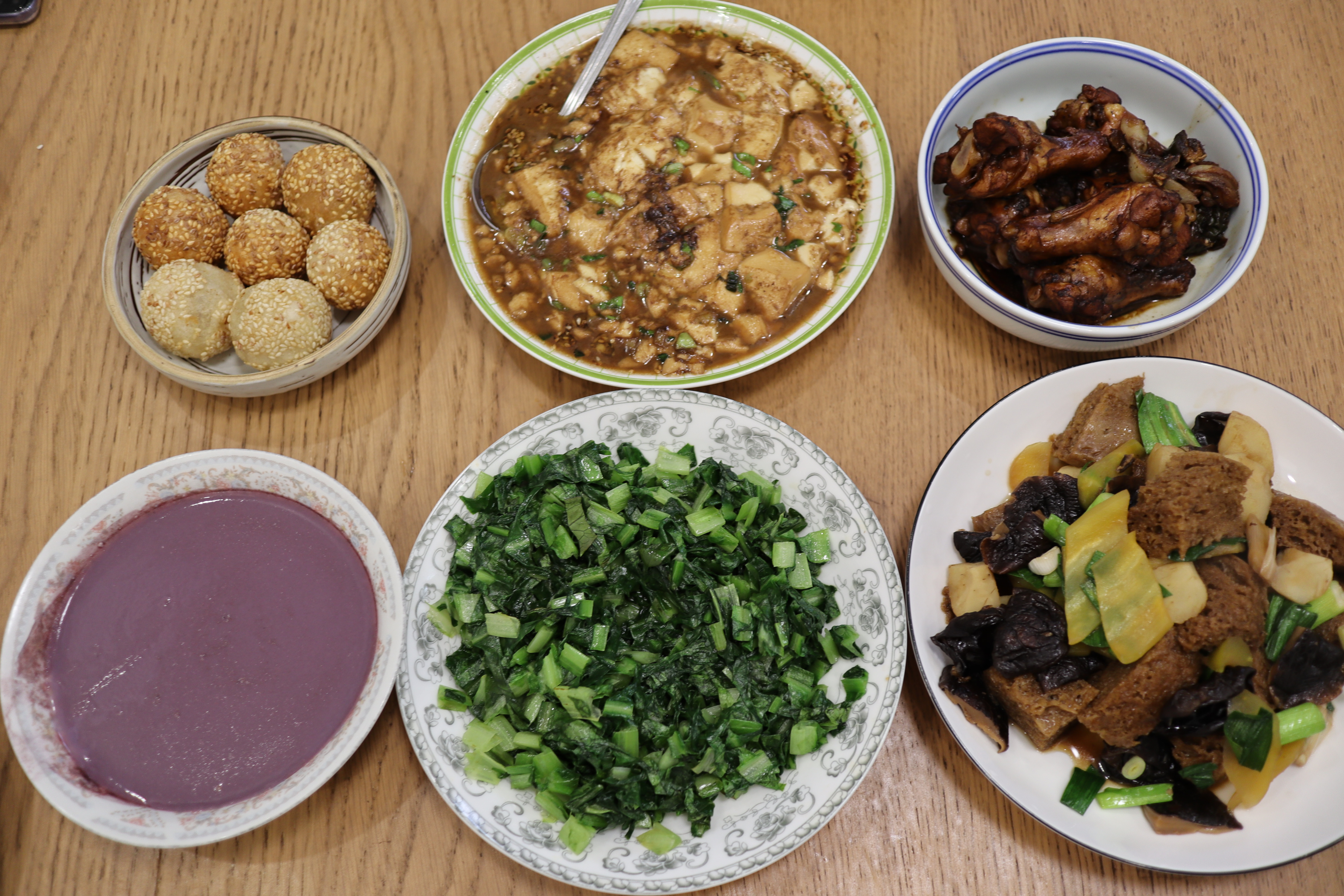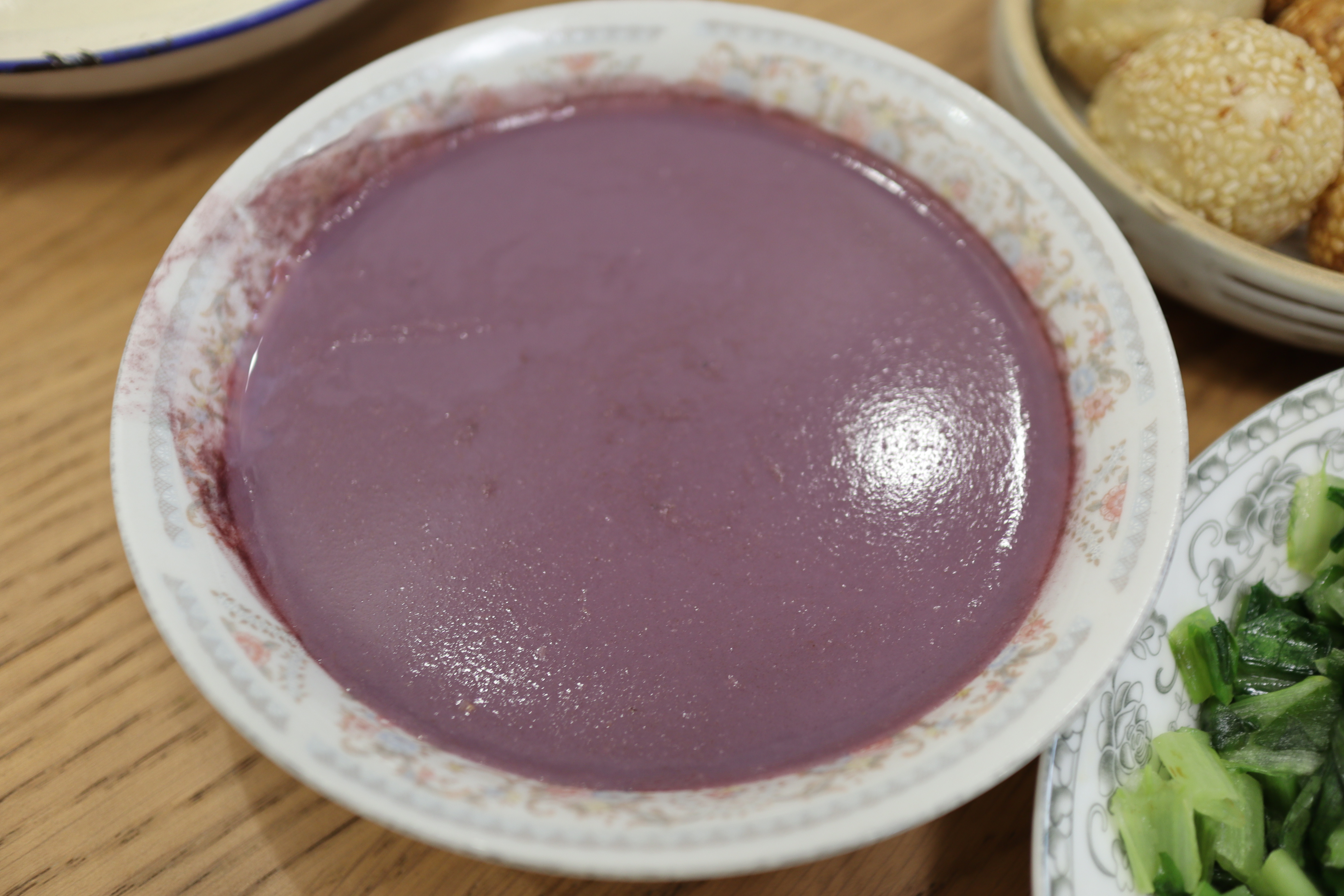 这紫色的是早上吃剩下的紫薯杂米糊,用豆浆机打的,非常细腻。剩下这碗热一热,谁想喝就吃完主食往自己碗里掉一些。经过破壁搅打后,食材中的营养完全释放出来,这日子口喝这些,有助于提高免疫力。