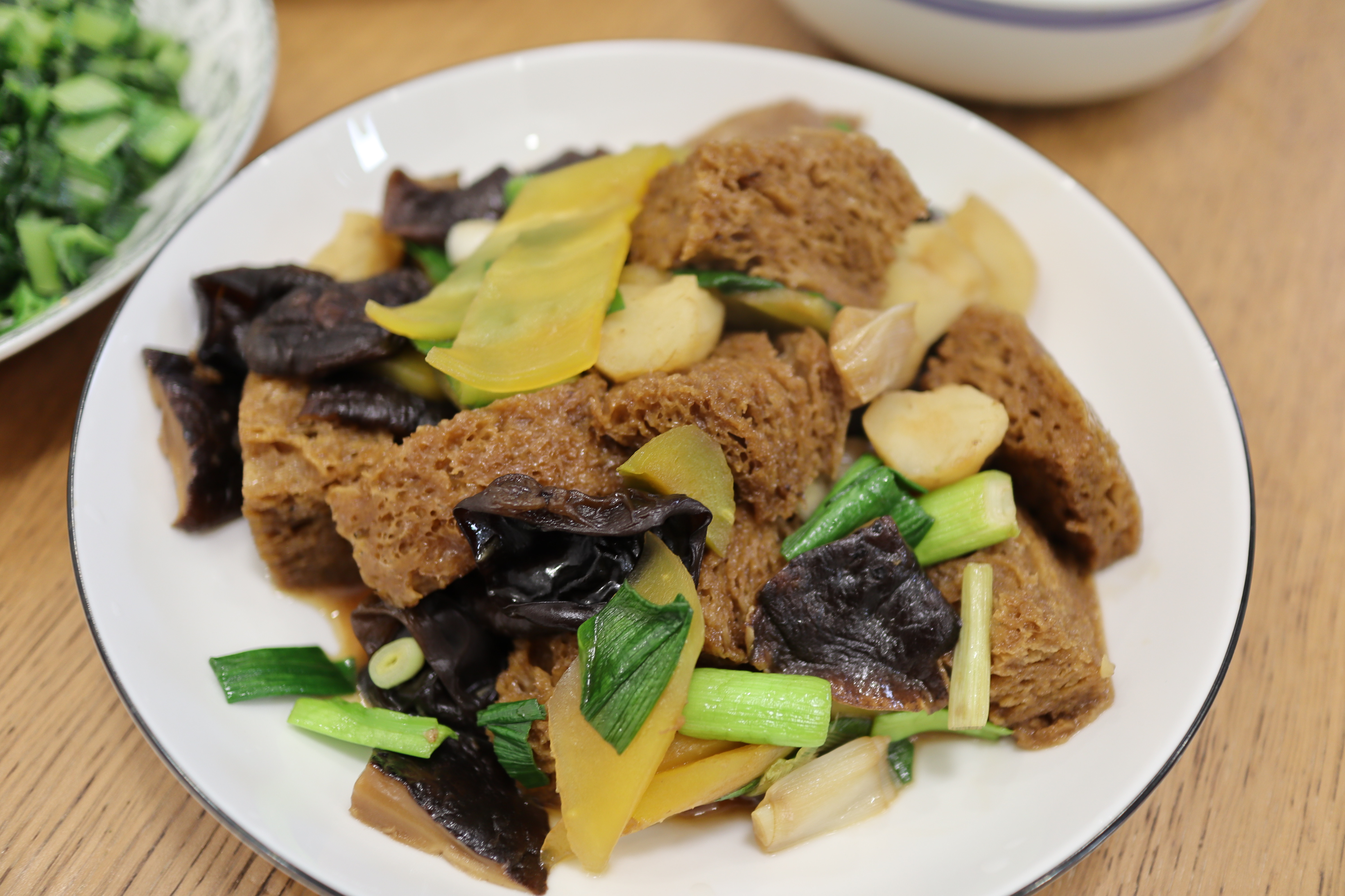 这一盘是我做的“四喜烤麸”。烤麸是我用面筋粉(谷朊粉)蒸的。咱们这些天大火的凉皮中就有这个面筋,就是那个切成方块、全身有很多小洞洞,看着像冻豆腐的东西。那是洗面剩下的面筋,放点酵母蒸一蒸,比海绵还暄软。这是北京的一道特色菜,尤其以稻香村做得最够味儿。我炒了一大锅,能吃两天,味道一点儿不输稻香村。