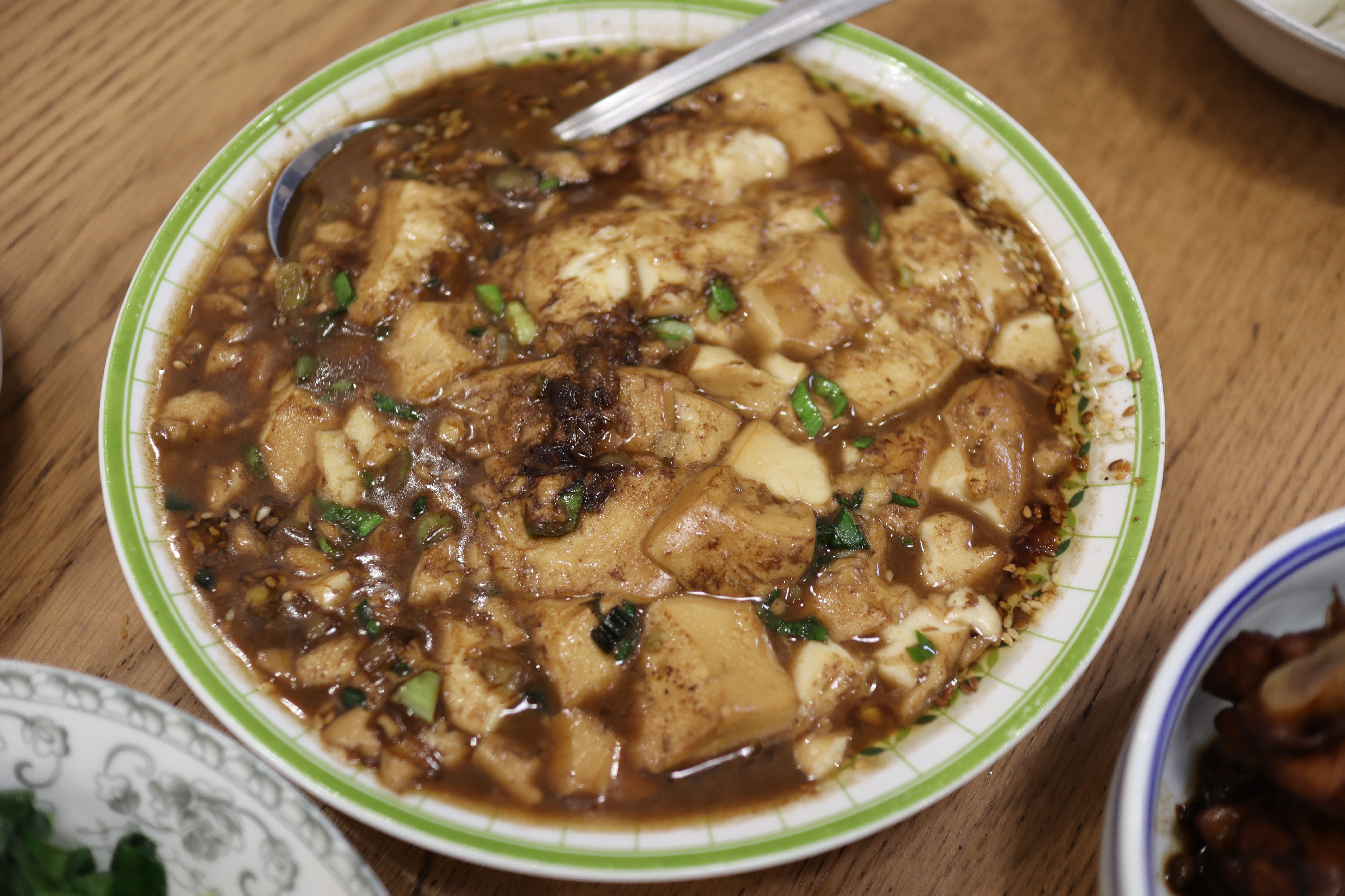 这盘烧豆腐别看样儿不怎么样,但是味道非常好。做法也简单,把葱花爆香,倒酱油蹿出香叶,再倒一碗水,把豆腐块入锅煮3分钟出锅。嫩嫩的豆腐特别入味,舀几勺浇在米饭上,呼噜噜就入肚儿了。