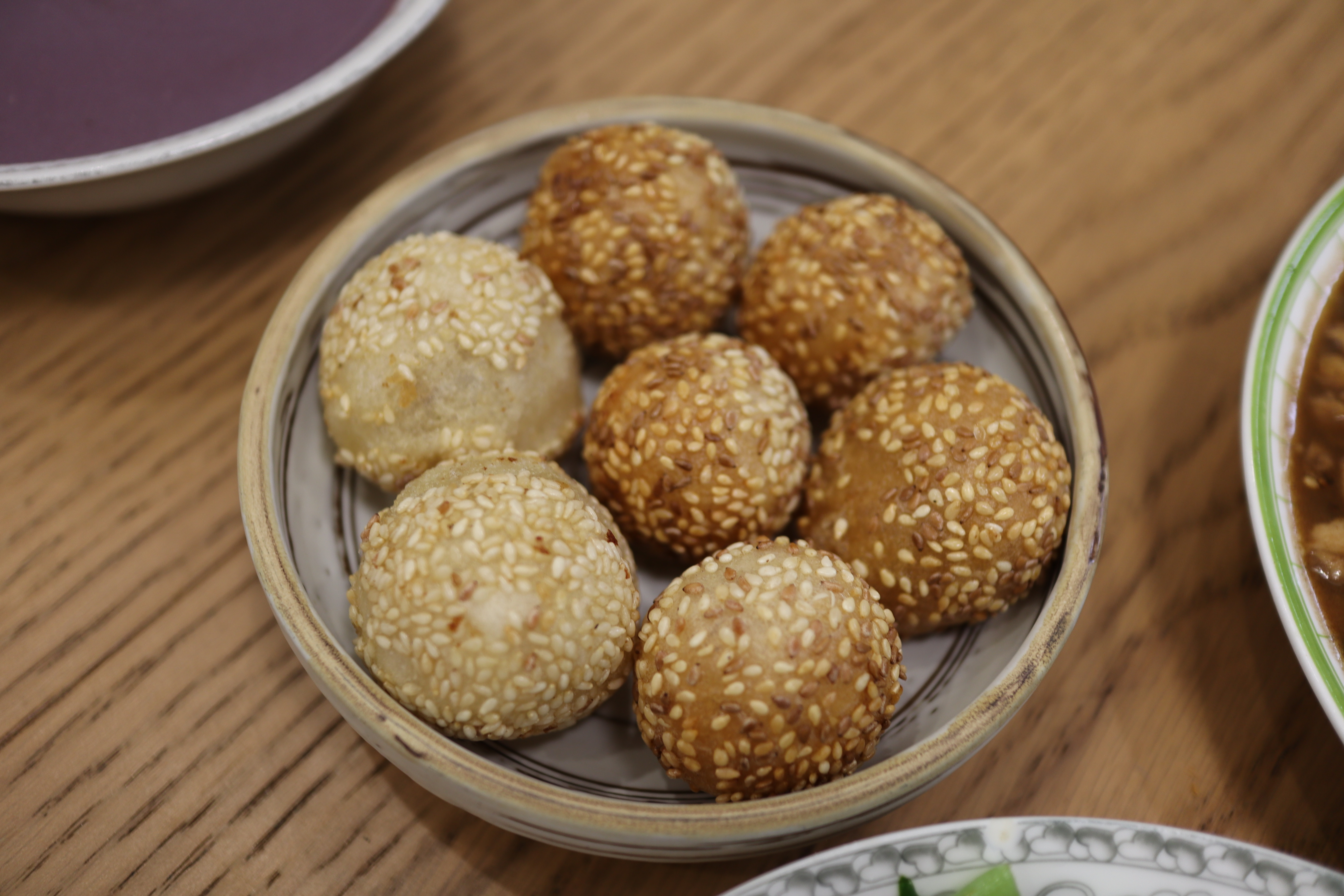 这一盘圆乎乎的是我今天炸的“麻团”。颜色浅的两个是带馅的;颜色深的、个头小的是空心的。看着容易做着难,我这两天再好好实践一下,争取做得完美写个食谱给各位。