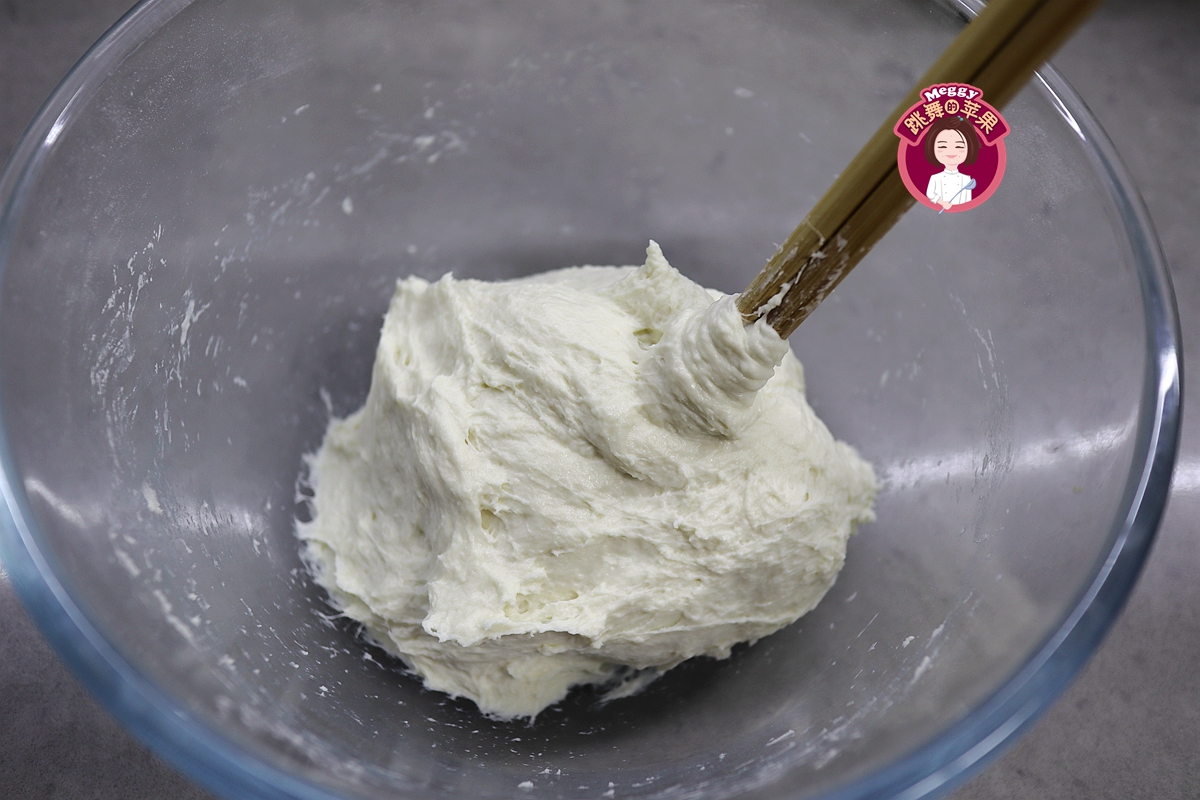 3. 依然不用手揉面,手紧握筷子在盆里不停地搅拌面团约2分钟;面团明显柔软滋润了;有力气的可以继续搅拌2分钟,使面团更加滋润、光滑;没力气的搅拌成图中的面团状态就可以了;