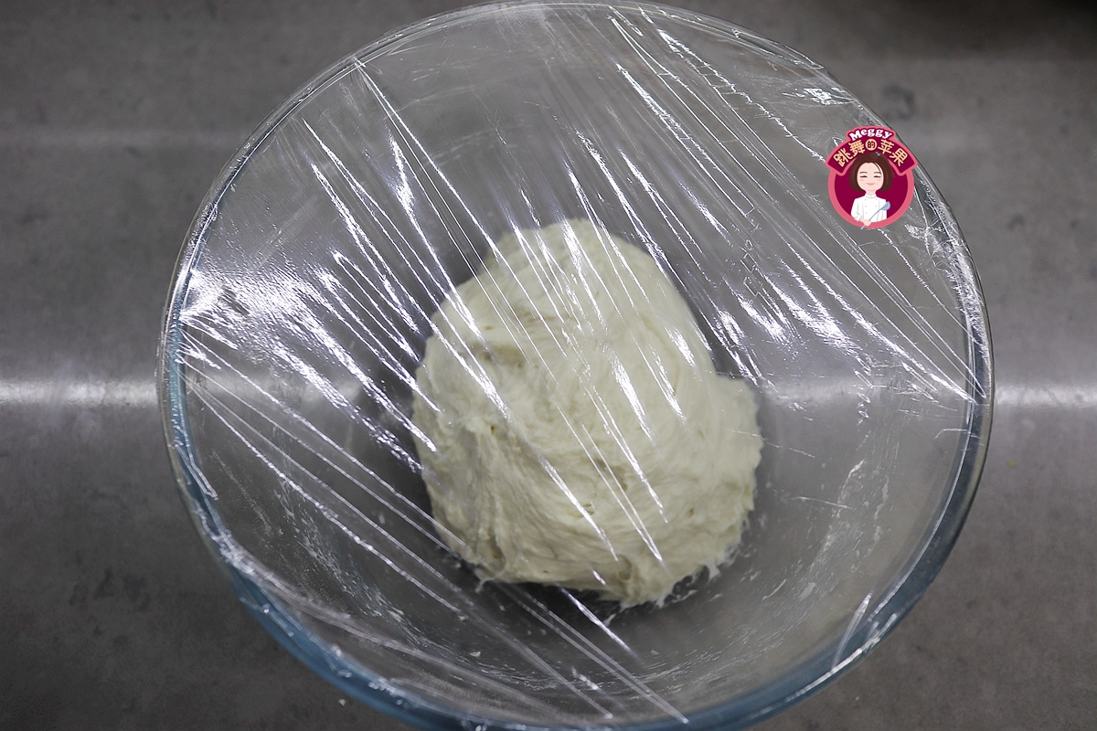 4. 蒙上保鲜膜,在屋温下发酵30分钟左右,再放入冰箱冷藏一晚;低温发酵的面团风味和口感比现揉现做的要好很多;