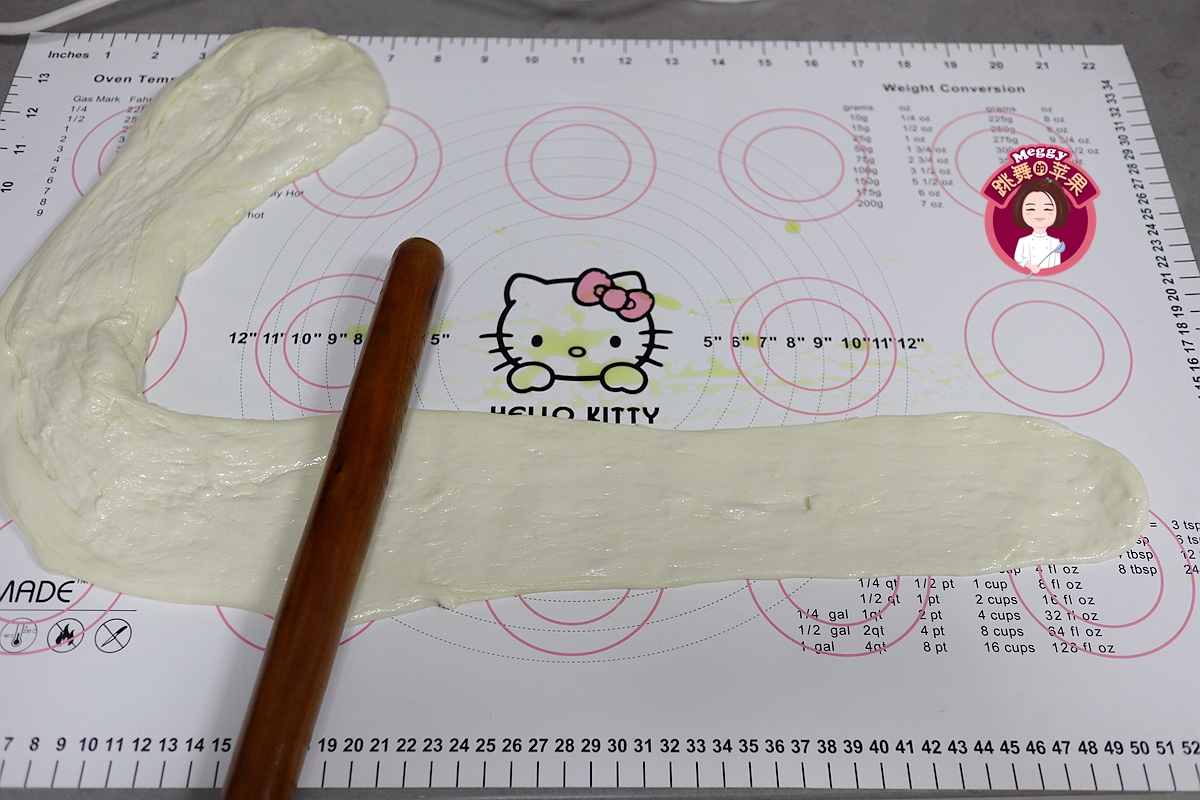 3. 面团放在案板上千万不要揉,直接用手拉扯成合适的宽度,擀面杖可用可不用;为什么不能重新揉面呢?因为重新揉面后,面团的组织遭到破坏,筋度加强了,还需要时间重新松弛,这就耽误时间了;